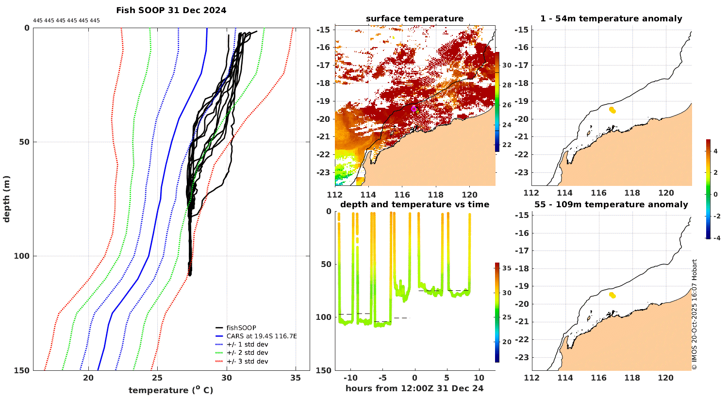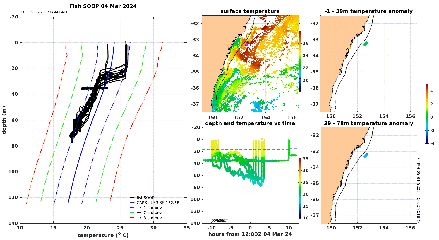 Left panel: The FishSOOP temperature observations from all deployments that day are shown as black lines. To get a sense of how 'normal' these observations are, we include the climatological average profile (as a bold blue line) at the location of the deepest FishSOOP deployment, as well as the average plus 1, 2 and 3 standard deviations (as thin blue, green and red lines - see key). The climatology used is the CSIRO Atlas of Regional Seas (CARS 2009), which is now quite old. See below for more on the issue of old vs recent observations in the context of global warming.