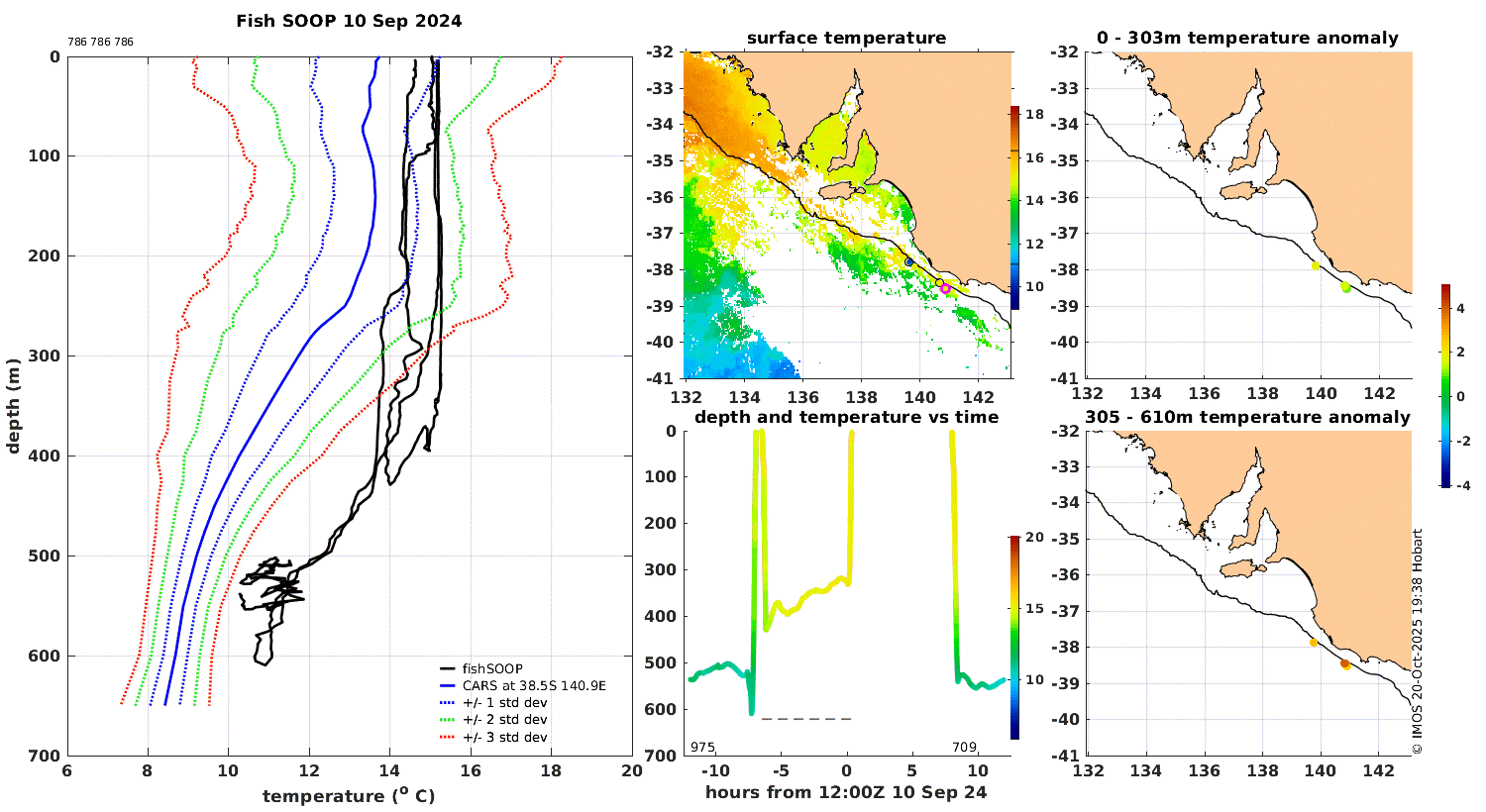 | The South Australian Current off Tasmania Much of the South Australian Current continues beyond the border with Victoria along the shelf edge west of Bass Strait then along the Tasmanian shelf edge where it is sometimes referred to as the Zeehan Current. Did the strong SAC observed by sensor 786 off the Bonney Coast (described above) show up off Tasmania as a strong Zeehan Current? Yes, according to sensor 785's measurements on 10 September 2024 at the shelf edge off Macquarie Harbour, which found near-normal temperature at the surface, but an anomaly of +3 ° at 400m, well outside of climatology plus 3 standard deviations. Notably, the temperature is completely isothermal from 0 to 400m. |