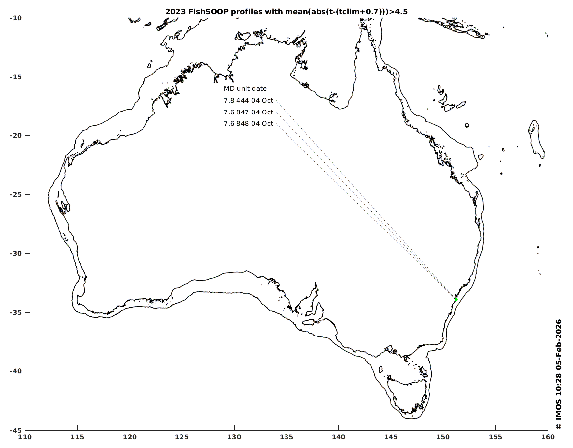 Next in the ranking come three FishSOOP deployments on 4 October 2023 with depth-averaged anomalies of 7.6 to 7.8° (averaged from surface to 15m). But these occurred at 33.917°S 151.235°E, which is on land. Some testing data has apparently slipped through the QC procedures, reminding us that automated quality control algorithms as well as expert assessors inevitably make mistakes deciding if extremes in the data are genuine, due the instrumental error, or human/context error.