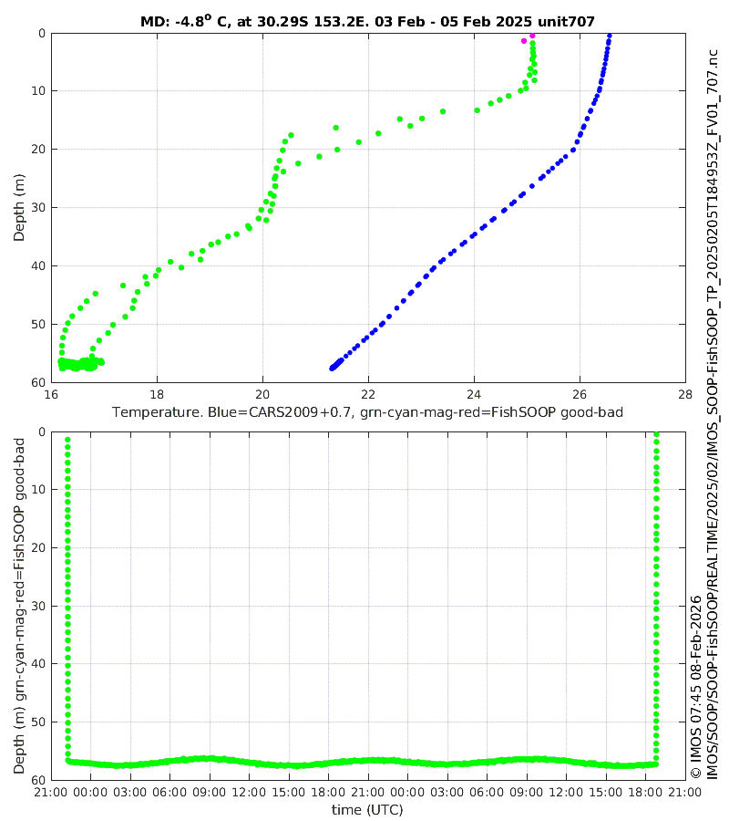 The most-extreme FishSOOP temperature anomaly was on 11 April 2025 at 24.8°S 156.6°E (see above). According to sensor 917, the temperature was about 25° from surface to bottom. This agrees with CARS (age corrected as mentioned) at the surface but differs by about 12° at 450m, giving an average from surface to 450m of 8.7°. At 450m, an anomaly of 12° is about 14 standard deviations from climatology (see the daily plot for SGBR), so the chance of this observation being correct would seem to be negligible. But could the sensor have sampled a really extreme warm-core eddy? We don't think so: the snapshot SST+altimetry SGBR image for the day shows a cyclonic (cold core) eddy in the vicinity, not a warm-core one. Could a tuna or a shark be involved? We don't know. Explanations aside, the lower panel of the plot above shows that the FishSOOP facility's QC procedures flagged the depth data as bad (denoted here by the dots being red), but the temperatures were still flagged good (something that tricked some of our plotting scripts; we will remake the plots at some point). The lesson here is that users need to check both quality flags.