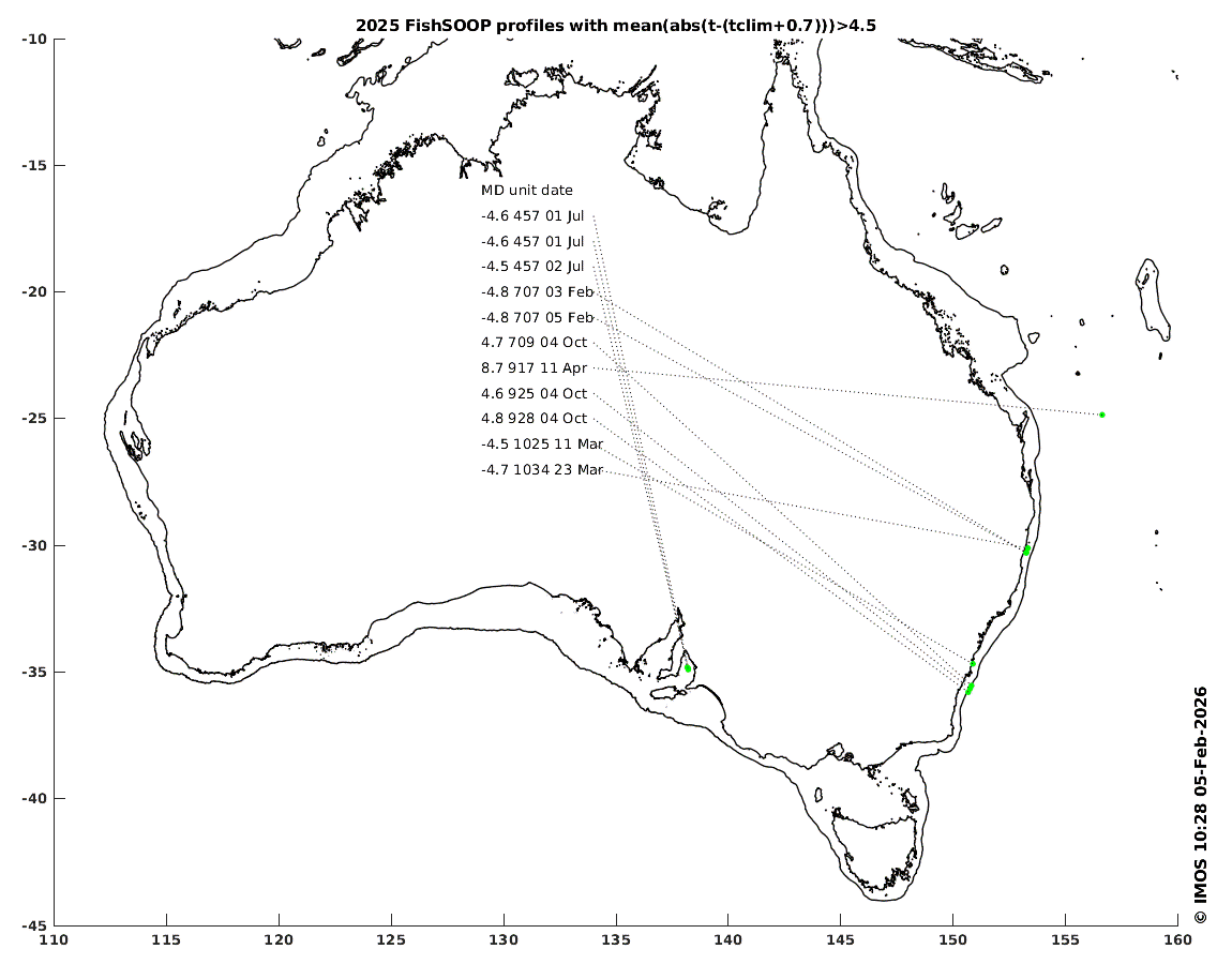 As of 10 Feb 2026, there has only been 1 depth-averaged absolute anomaly greater than 4.5° this year. This was on 23 January off the NSW Central Coast in EAC waters, where the temperature was 26.2° from surface to 70m (where CARS says there would normally be a strong thermocline). See also nearby profiles.