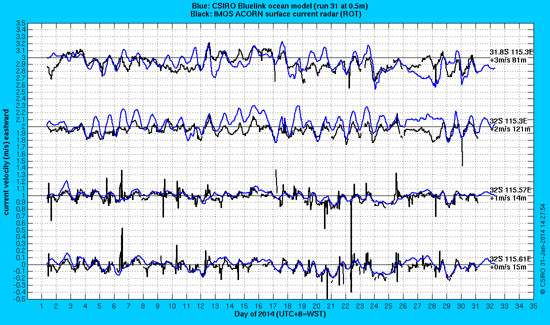 2) time-series comparisons of modelled and observed surface current: