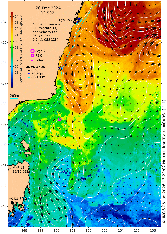 You might have read our August 2024 news item about a new experimental satellite called SWOT, which gives us very detailed views of ocean current velocities, but not very often. We've shown below the latest-available SWOT data overlain on SST imagery for the time, showing weak currents near Sydney on 12 Dec. [other dates][Syd-Hob][Tas]
