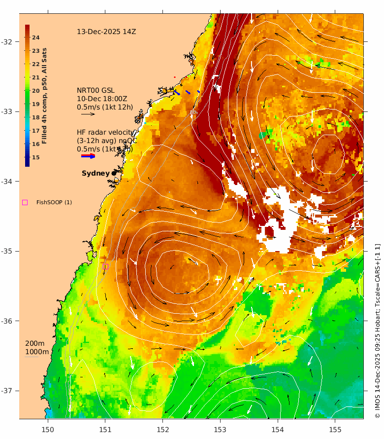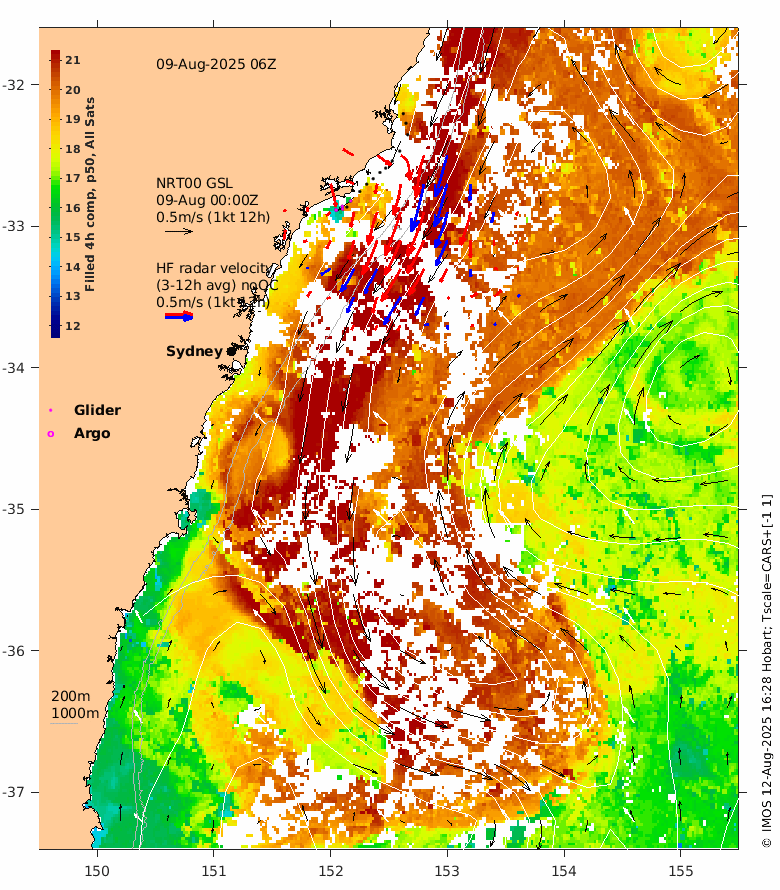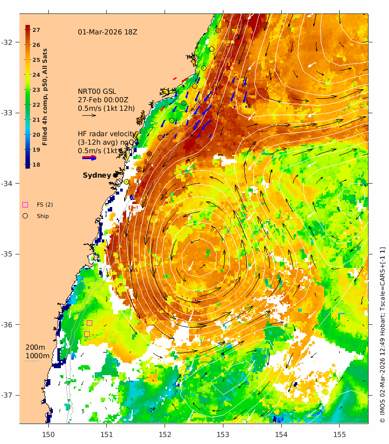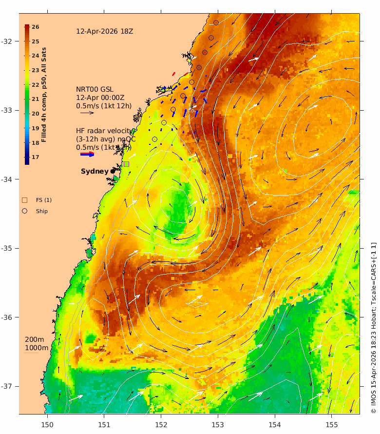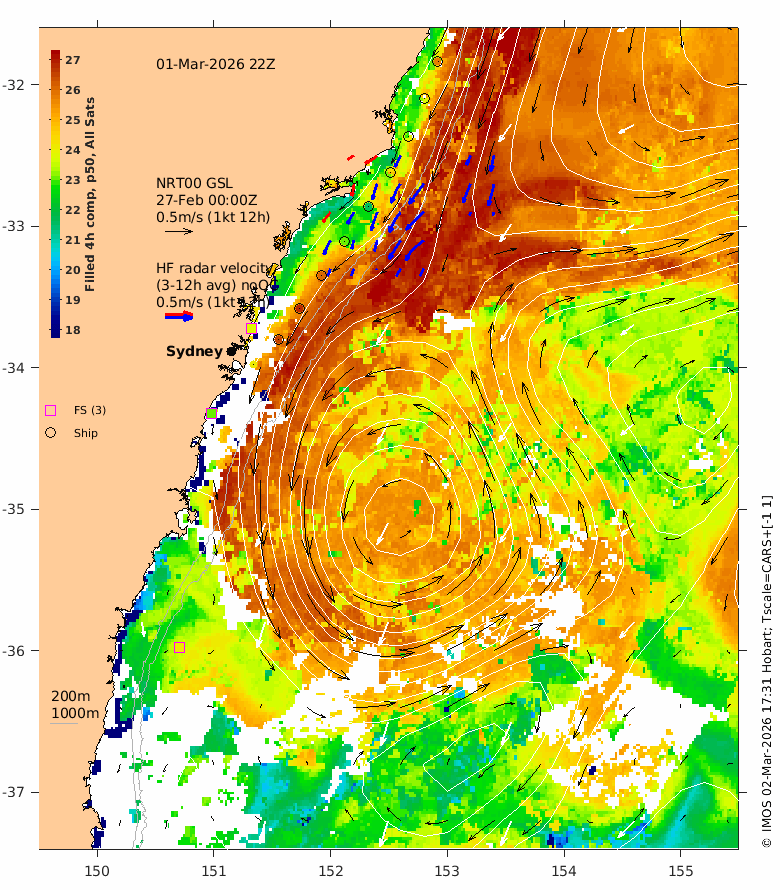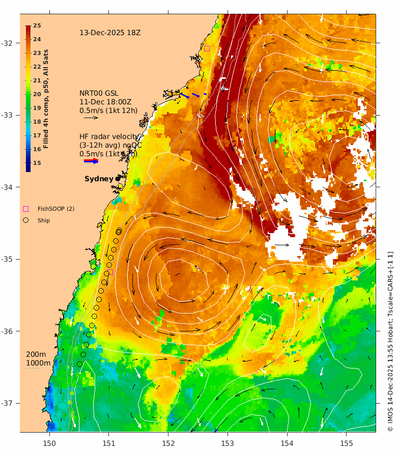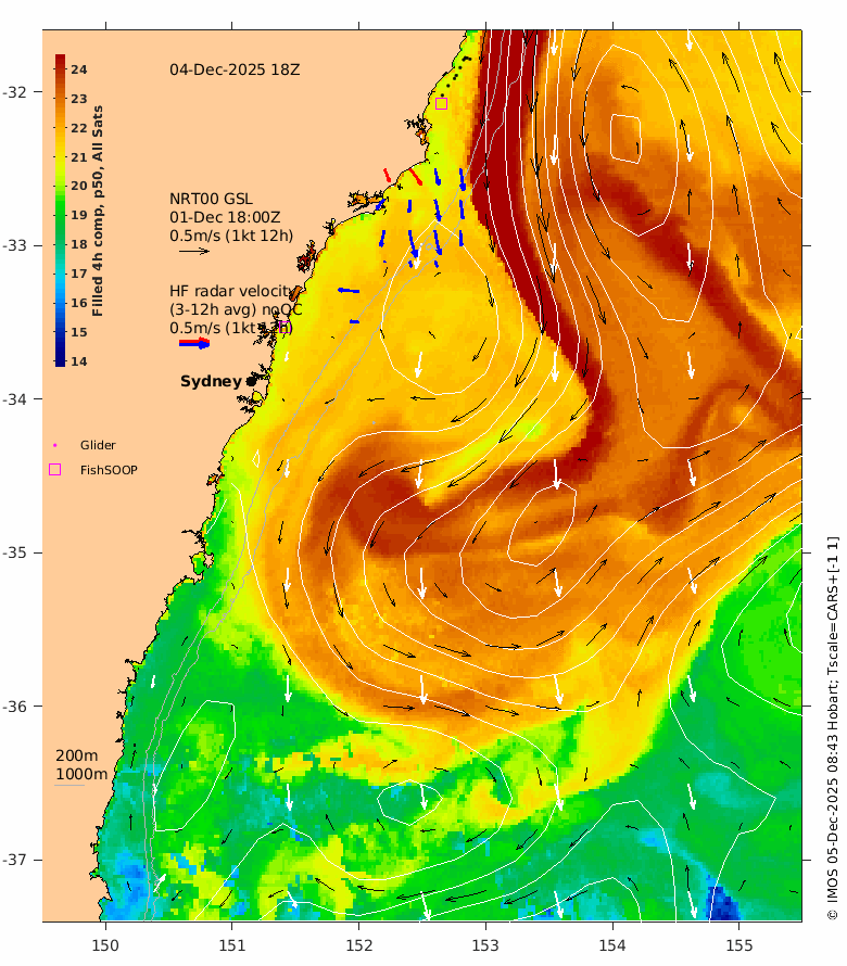 The latest GSLA (NRT00) is usually 4 days behind real time - the date of the GSLA and velocity vectors is indicated on the plot.