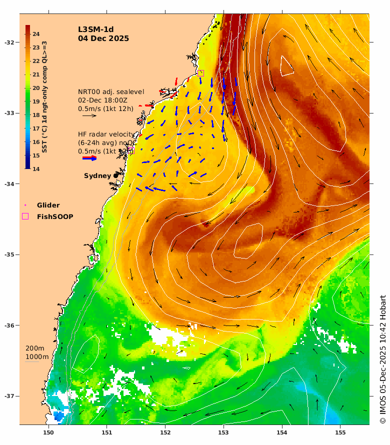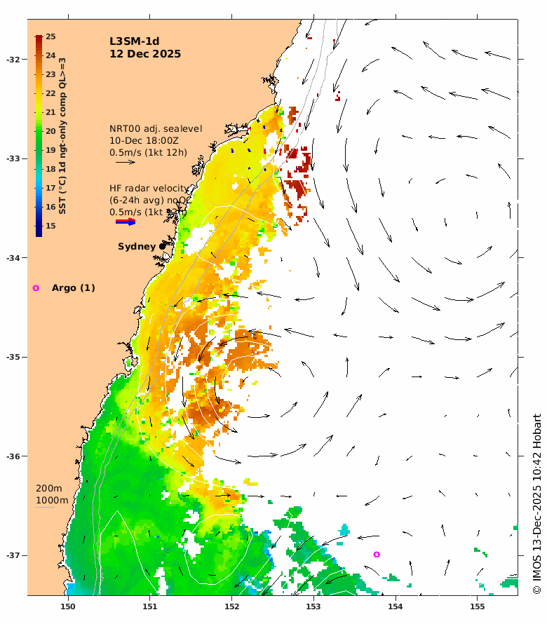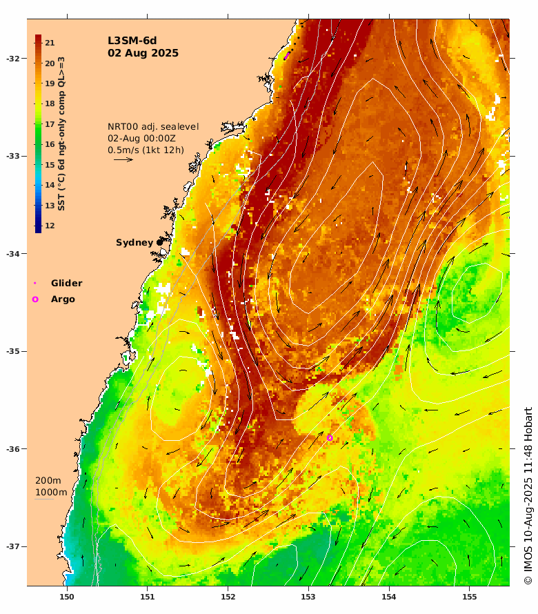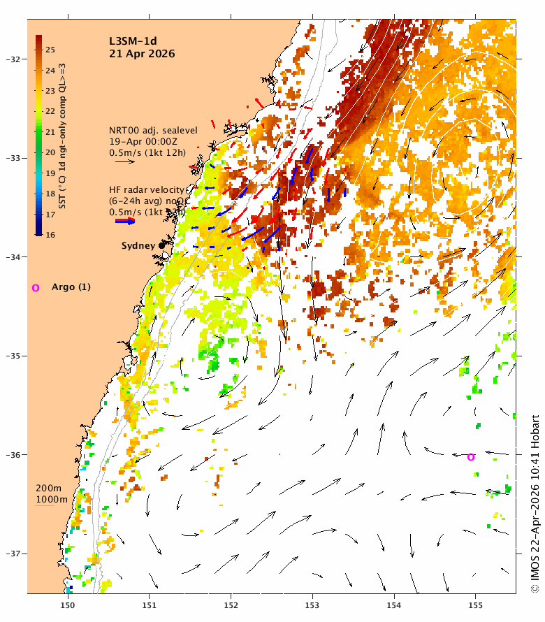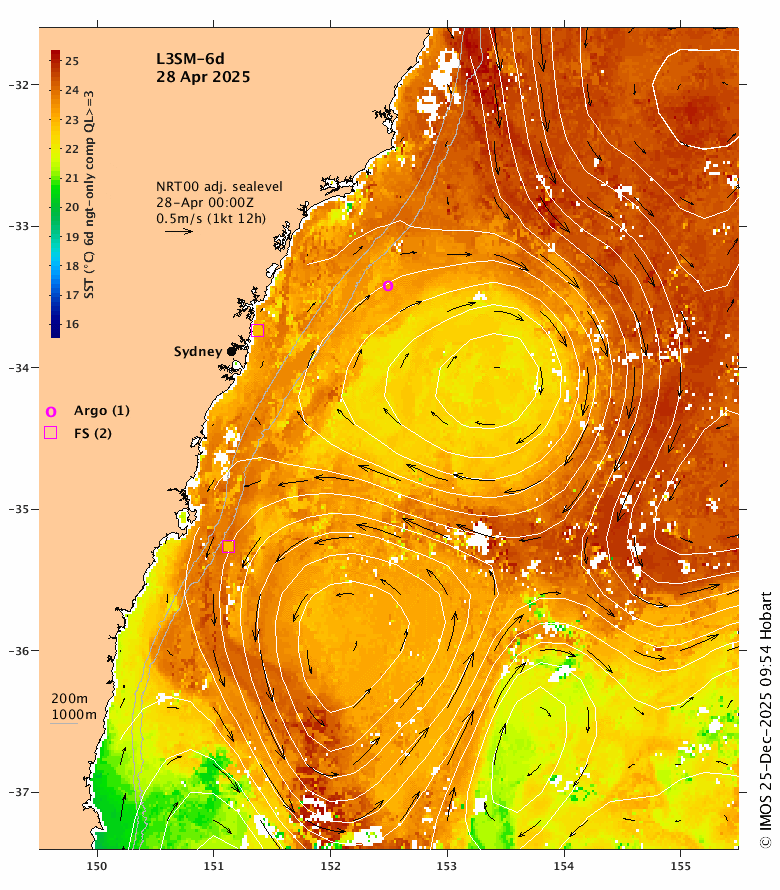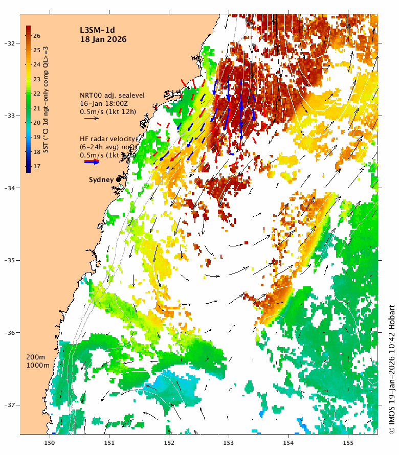 SST: 6-day composite SST (L3S-6d, QL≥2) using night-only SST in a 6-day window centred on t0, the analysis time. The 6-day window is used to maximise coverage and night-only SST is used to minimise bias due to diurnal heating. The 6d composites are produced by the BoM for IMOS using GHRSST protocol on a 2x2km grid. All SST is adjusted by the SSES bias before compositing and an offset of 0.17C is added to obtain the bulk SST.