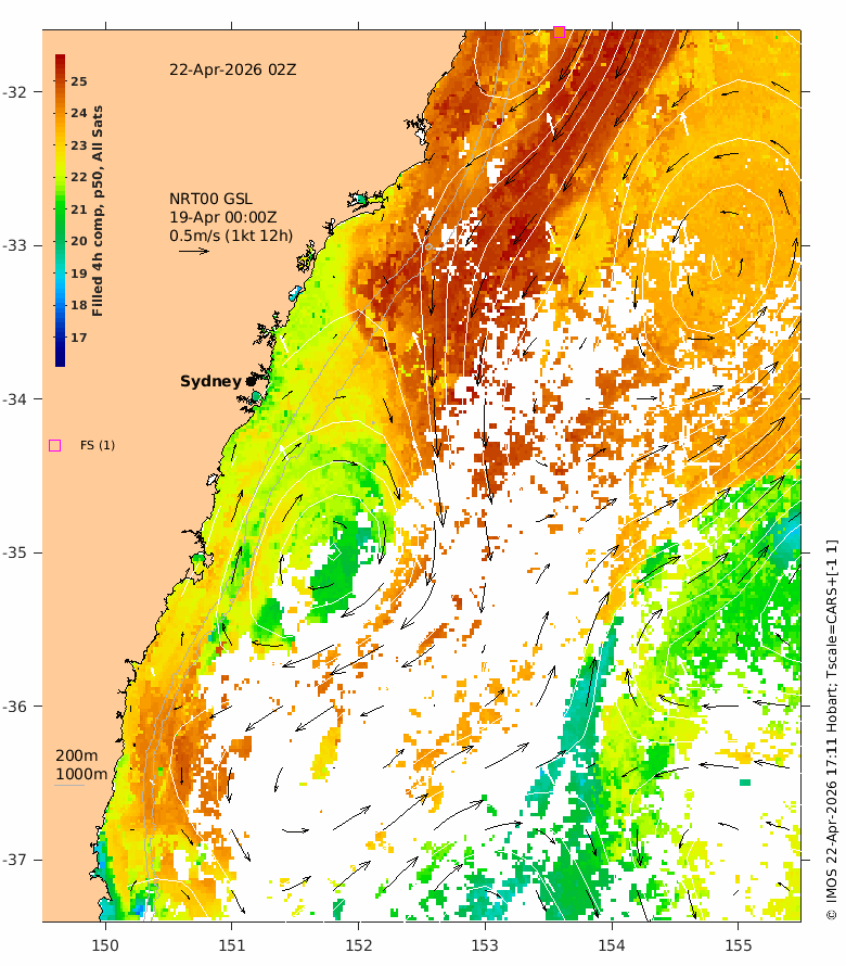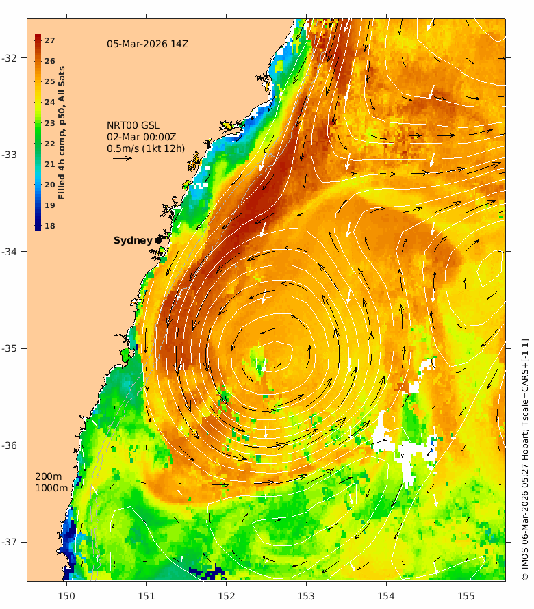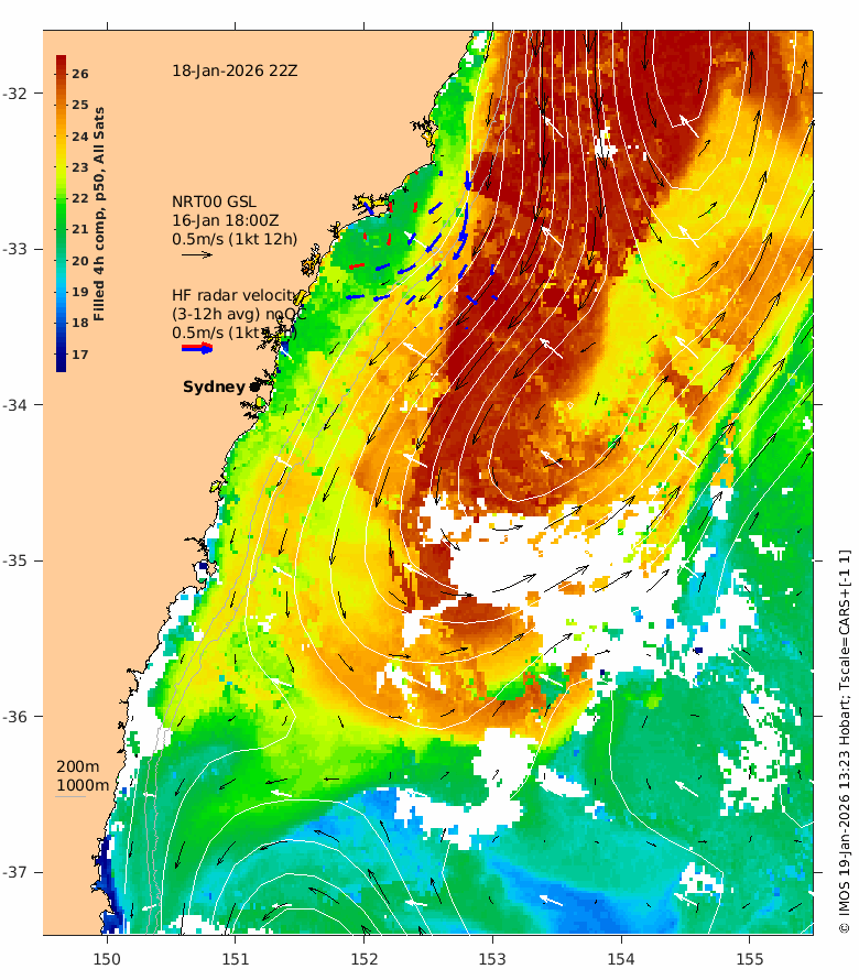 The latest GSLA (NRT00) is usually 4 days behind real time - the date of the GSLA and velocity vectors is indicated on the plot.