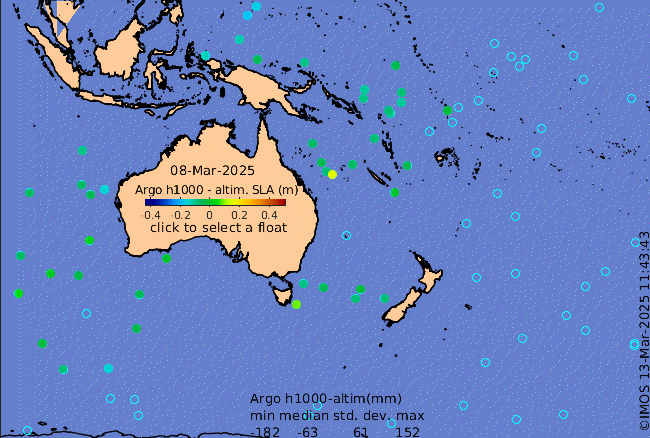 Click on the map below or choose a [WMO number] to see the temperature and salinity data from the selected float compared with satellite-adjusted climatology.