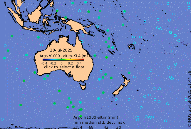 Click on the map below or choose a [WMO number] to see the temperature and salinity data from the selected float compared with satellite-adjusted climatology.