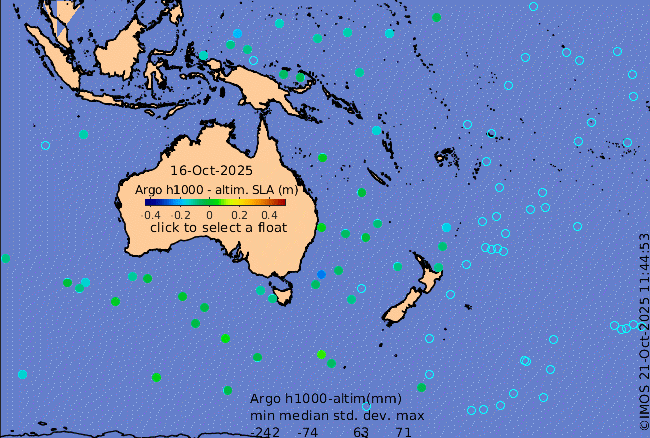 Click on the map below or choose a [WMO number] to see the temperature and salinity data from the selected float compared with satellite-adjusted climatology.