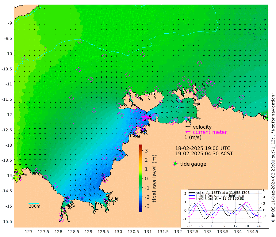 166cm/s -101T +4cm/s rms + 6cm/s 51T. Darwin_C1 52m 127cm/s -91T +4cm/s rms + 7cm/s -161T. Darwin_CW1 22m 91cm/s -106T +4cm/s rms + 8cm/s 61T. Darwin_CW2 34m 81cm/s -136T +3cm/s rms + 9cm/s 98T. Darwin_CW3 22m 152cm/s -91T +5cm/s rms + 7cm/s 88T. Darwin_C3 56m 99cm/s -115T +2cm/s rms + 9cm/s -126T. Darwin_CTbW 22m 7cm/s -174T +9cm/s rms + 2cm/s -110T. NWSLYN 196m 18cm/s -110T +1cm/s rms + 1cm/s -47T. DARBGF 30m 7cm/s 83T +7cm/s rms + 2cm/s -137T. ITFTIS 464m 8cm/s 81T +9cm/s rms + 1cm/s 74T. ITFMHB 146m 12cm/s 64T +4cm/s rms + 1cm/s -134T. ITFJBG 61m 15cm/s 99T +6cm/s rms + 4cm/s 121T. ITFFTB 108m 11cm/s -114T +4cm/s rms + 3cm/s 80T. NRSDAR 19m 30cm Carronade Island 27cm Guy Point 30cm Napier Broome Bay -72cm Lesueur Island -155cm Reveley Island -68cm Rocky Island -233cm Cape Domett -215cm Lacrosse Island -253cm Adolphus Island -192cm Pender Point -185cm Wyndham -24cm The Boxers -38cm Unnamed Shoal 23cm Loxton Shoal -252cm Pelican Island -15cm Calder Shoal 11cm Evans Shoal -312cm Quoin Island -232cm Port Keats -217cm Jones Point -265cm Catfish Island -174cm Cape Scott Offshore -113cm Cape Ford -191cm Anson Bay 0cm Goodrich Bank -169cm Peron Island North -149cm Point Jenny -147cm Native Point -163cm Fish Reef -177cm Tapa Bay -78cm Point Fawcett (Offshore) -185cm Burge Point -161cm Munkunuwa -124cm Beagle A -192cm Parsons Bank -177cm Fenton Patches 4cm Lynedoch Bank -196cm Hancox Shoal Area -208cm Nightcliff -218cm Darwin -192cm Charles Point Patches -167cm Glyde Point -152cm Chambers Bay -146cm Point Stuart -152cm Cape Hotham -136cm Christine Reef -158cm West Alligator Head -148cm East Field Island -133cm Two Hills Bay -83cm Newby Shoal -123cm Camp Point -176cm Medina Inlet South -63cm South Barlow Point -37cm St. Asaph Bay -1cm Cape Van Dieman -15cm Snake Bay -9cm Cache Point 40cm Echo Shoal -30cm Point Jahleel (Off) -75cm Cape Don -35cm Port Essington -38cm Smith Point - West -35cm NW Peacock Island -27cm North Of Jones Shoal -11cm Peacock Island -56cm Point David -41cm D'urville Point -29cm Money Shoal -58cm Copeland Island -80cm Cape Cockburn -57cm One Tree Point -69cm Hogmany Shoal -58cm New Year Island - West -62cm Grant Island -81cm Aurari Bay -91cm Cuthbert Point -80cm North Goulburn Island -101cm Paxie Shoal -113cm Entrance Island -133cm Yabooma Island