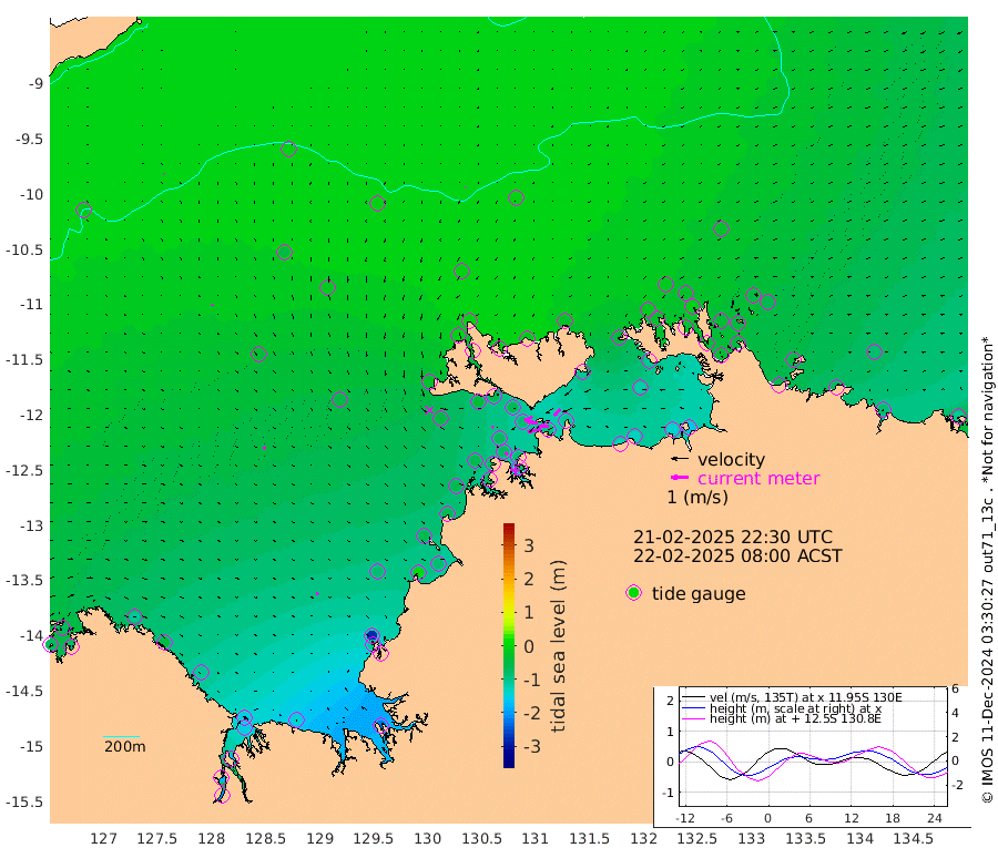 80cm/s -102T +4cm/s rms + 6cm/s 51T. Darwin_C1 52m 55cm/s -92T +4cm/s rms + 7cm/s -161T. Darwin_CW1 22m 20cm/s -104T +4cm/s rms + 8cm/s 61T. Darwin_CW2 34m 51cm/s -138T +3cm/s rms + 9cm/s 98T. Darwin_CW3 22m 44cm/s -88T +5cm/s rms + 7cm/s 88T. Darwin_C3 56m 53cm/s -115T +2cm/s rms + 9cm/s -126T. Darwin_CTbW 22m 4cm/s -156T +9cm/s rms + 2cm/s -110T. NWSLYN 196m 11cm/s 108T +1cm/s rms + 1cm/s -47T. DARBGF 30m 5cm/s 138T +7cm/s rms + 2cm/s -137T. ITFTIS 464m 8cm/s 165T +9cm/s rms + 1cm/s 74T. ITFMHB 146m 15cm/s 143T +4cm/s rms + 1cm/s -134T. ITFJBG 61m 15cm/s 134T +6cm/s rms + 4cm/s 121T. ITFFTB 108m 19cm/s 132T +4cm/s rms + 3cm/s 80T. NRSDAR 19m -77cm Carronade Island -77cm Guy Point -84cm Napier Broome Bay -108cm Lesueur Island -106cm Reveley Island -46cm Rocky Island -148cm Cape Domett -147cm Lacrosse Island -170cm Adolphus Island -180cm Pender Point -205cm Wyndham -37cm The Boxers -45cm Unnamed Shoal -6cm Loxton Shoal -146cm Pelican Island -20cm Calder Shoal -2cm Evans Shoal -214cm Quoin Island -111cm Port Keats -107cm Jones Point -280cm Catfish Island -82cm Cape Scott Offshore 1cm Cape Ford -84cm Anson Bay -3cm Goodrich Bank -67cm Peron Island North -60cm Point Jenny -58cm Native Point -61cm Fish Reef -70cm Tapa Bay -30cm Point Fawcett (Offshore) -68cm Burge Point -39cm Munkunuwa -51cm Beagle A -65cm Parsons Bank -72cm Fenton Patches -7cm Lynedoch Bank -81cm Hancox Shoal Area -88cm Nightcliff -85cm Darwin -74cm Charles Point Patches -99cm Glyde Point -128cm Chambers Bay -132cm Point Stuart -102cm Cape Hotham -116cm Christine Reef -145cm West Alligator Head -159cm East Field Island -107cm Two Hills Bay -55cm Newby Shoal -102cm Camp Point -61cm Medina Inlet South -13cm South Barlow Point -10cm St. Asaph Bay -2cm Cape Van Dieman -7cm Snake Bay -12cm Cache Point -13cm Echo Shoal -23cm Point Jahleel (Off) -50cm Cape Don -22cm Port Essington -23cm Smith Point - West -24cm NW Peacock Island -20cm North Of Jones Shoal -8cm Peacock Island -40cm Point David -25cm D'urville Point -26cm Money Shoal -41cm Copeland Island -54cm Cape Cockburn -40cm One Tree Point -56cm Hogmany Shoal -48cm New Year Island - West -46cm Grant Island -62cm Aurari Bay -71cm Cuthbert Point -56cm North Goulburn Island -83cm Paxie Shoal -86cm Entrance Island -102cm Yabooma Island