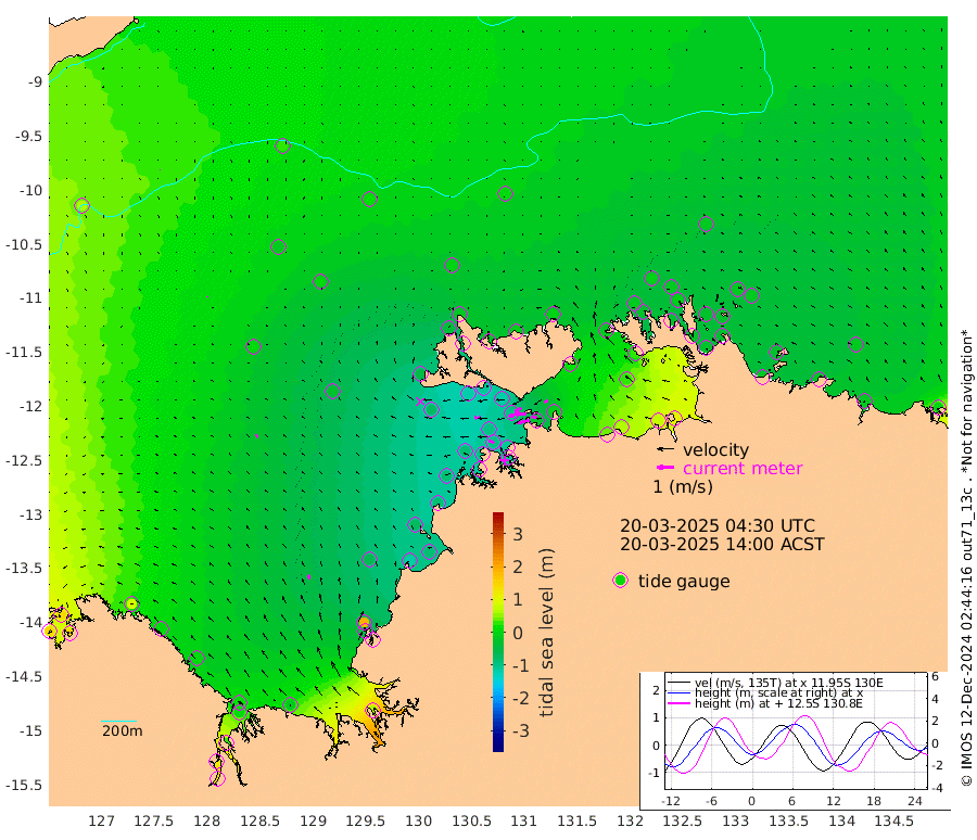 76cm/s -103T +4cm/s rms + 6cm/s 51T. Darwin_C1 52m 29cm/s -88T +4cm/s rms + 7cm/s -161T. Darwin_CW1 22m 66cm/s -110T +4cm/s rms + 8cm/s 61T. Darwin_CW2 34m 25cm/s -112T +3cm/s rms + 9cm/s 98T. Darwin_CW3 22m 66cm/s -93T +5cm/s rms + 7cm/s 88T. Darwin_C3 56m 42cm/s -117T +2cm/s rms + 9cm/s -126T. Darwin_CTbW 22m 1cm/s 81T +9cm/s rms + 2cm/s -110T. NWSLYN 196m 40cm/s -92T +1cm/s rms + 1cm/s -47T. DARBGF 30m 0cm/s -134T +7cm/s rms + 2cm/s -137T. ITFTIS 464m 4cm/s 11T +9cm/s rms + 1cm/s 74T. ITFMHB 146m 28cm/s -17T +4cm/s rms + 1cm/s -134T. ITFJBG 61m 18cm/s -34T +6cm/s rms + 4cm/s 121T. ITFFTB 108m 35cm/s -64T +4cm/s rms + 3cm/s 80T. NRSDAR 19m 137cm Carronade Island 139cm Guy Point 141cm Napier Broome Bay 80cm Lesueur Island 7cm Reveley Island 10cm Rocky Island 5cm Cape Domett 18cm Lacrosse Island 31cm Adolphus Island 113cm Pender Point 157cm Wyndham 8cm The Boxers -16cm Unnamed Shoal 30cm Loxton Shoal -21cm Pelican Island 1cm Calder Shoal 12cm Evans Shoal 59cm Quoin Island -67cm Port Keats -60cm Jones Point 190cm Catfish Island -63cm Cape Scott Offshore -115cm Cape Ford -88cm Anson Bay -11cm Goodrich Bank -77cm Peron Island North -87cm Point Jenny -89cm Native Point -87cm Fish Reef -98cm Tapa Bay -47cm Point Fawcett (Offshore) -106cm Burge Point -116cm Munkunuwa -75cm Beagle A -114cm Parsons Bank -96cm Fenton Patches 1cm Lynedoch Bank -95cm Hancox Shoal Area -103cm Nightcliff -107cm Darwin -100cm Charles Point Patches -32cm Glyde Point 39cm Chambers Bay 59cm Point Stuart -3cm Cape Hotham 32cm Christine Reef 71cm West Alligator Head 105cm East Field Island 27cm Two Hills Bay -33cm Newby Shoal 18cm Camp Point -102cm Medina Inlet South -63cm South Barlow Point -37cm St. Asaph Bay -17cm Cape Van Dieman -24cm Snake Bay -7cm Cache Point 58cm Echo Shoal -11cm Point Jahleel (Off) -16cm Cape Don -21cm Port Essington -23cm Smith Point - West -20cm NW Peacock Island -10cm North Of Jones Shoal -5cm Peacock Island -27cm Point David -27cm D'urville Point -15cm Money Shoal -27cm Copeland Island -31cm Cape Cockburn -23cm One Tree Point -18cm Hogmany Shoal -19cm New Year Island - West -24cm Grant Island -22cm Aurari Bay -19cm Cuthbert Point -25cm North Goulburn Island -12cm Paxie Shoal -20cm Entrance Island -11cm Yabooma Island