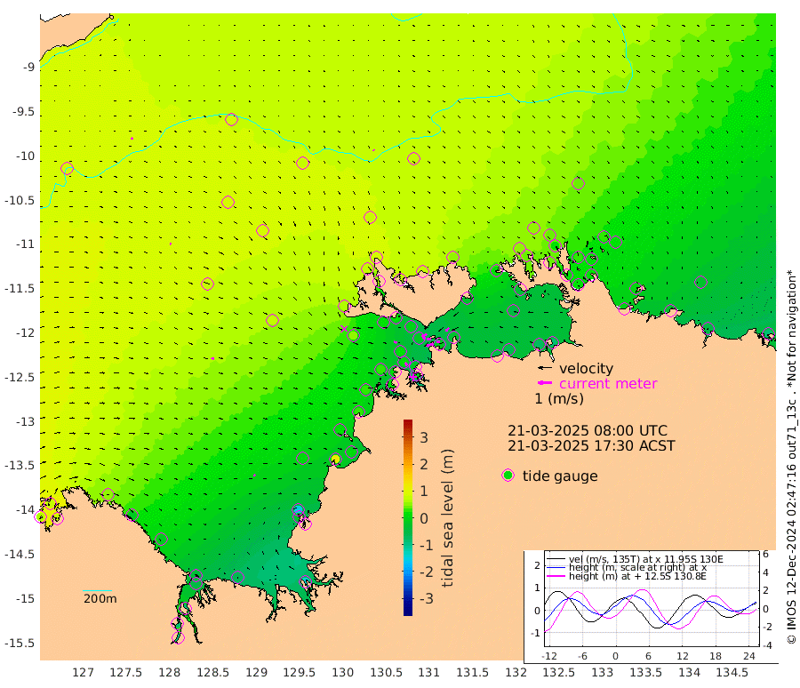 61cm/s -101T +4cm/s rms + 6cm/s 51T. Darwin_C1 52m 23cm/s -91T +4cm/s rms + 7cm/s -161T. Darwin_CW1 22m 18cm/s -108T +4cm/s rms + 8cm/s 61T. Darwin_CW2 34m 32cm/s -134T +3cm/s rms + 9cm/s 98T. Darwin_CW3 22m 30cm/s -90T +5cm/s rms + 7cm/s 88T. Darwin_C3 56m 40cm/s -115T +2cm/s rms + 9cm/s -126T. Darwin_CTbW 22m 7cm/s 123T +9cm/s rms + 2cm/s -110T. NWSLYN 196m 19cm/s 98T +1cm/s rms + 1cm/s -47T. DARBGF 30m 11cm/s 43T +7cm/s rms + 2cm/s -137T. ITFTIS 464m 11cm/s 75T +9cm/s rms + 1cm/s 74T. ITFMHB 146m 13cm/s 113T +4cm/s rms + 1cm/s -134T. ITFJBG 61m 21cm/s 99T +6cm/s rms + 4cm/s 121T. ITFFTB 108m 22cm/s 138T +4cm/s rms + 3cm/s 80T. NRSDAR 19m 68cm Carronade Island 66cm Guy Point 70cm Napier Broome Bay 52cm Lesueur Island -17cm Reveley Island -13cm Rocky Island -53cm Cape Domett -37cm Lacrosse Island -87cm Adolphus Island -83cm Pender Point -90cm Wyndham 79cm The Boxers 80cm Unnamed Shoal 89cm Loxton Shoal -65cm Pelican Island 88cm Calder Shoal 78cm Evans Shoal -136cm Quoin Island -30cm Port Keats -25cm Jones Point -150cm Catfish Island 5cm Cape Scott Offshore 119cm Cape Ford 0cm Anson Bay 78cm Goodrich Bank 17cm Peron Island North 24cm Point Jenny 27cm Native Point 23cm Fish Reef 15cm Tapa Bay 65cm Point Fawcett (Offshore) 13cm Burge Point 15cm Munkunuwa 45cm Beagle A -7cm Parsons Bank 15cm Fenton Patches 70cm Lynedoch Bank -15cm Hancox Shoal Area -12cm Nightcliff -7cm Darwin 16cm Charles Point Patches -21cm Glyde Point -56cm Chambers Bay -62cm Point Stuart -29cm Cape Hotham -52cm Christine Reef -74cm West Alligator Head -81cm East Field Island -37cm Two Hills Bay 69cm Newby Shoal -24cm Camp Point 16cm Medina Inlet South 64cm South Barlow Point 74cm St. Asaph Bay 79cm Cape Van Dieman 76cm Snake Bay 75cm Cache Point 89cm Echo Shoal 56cm Point Jahleel (Off) 20cm Cape Don 47cm Port Essington 43cm Smith Point - West 42cm NW Peacock Island 53cm North Of Jones Shoal 17cm Peacock Island 20cm Point David 39cm D'urville Point 42cm Money Shoal 14cm Copeland Island 20cm Cape Cockburn 23cm One Tree Point 21cm Hogmany Shoal 25cm New Year Island - West 19cm Grant Island -6cm Aurari Bay -23cm Cuthbert Point 1cm North Goulburn Island -30cm Paxie Shoal -48cm Entrance Island -81cm Yabooma Island