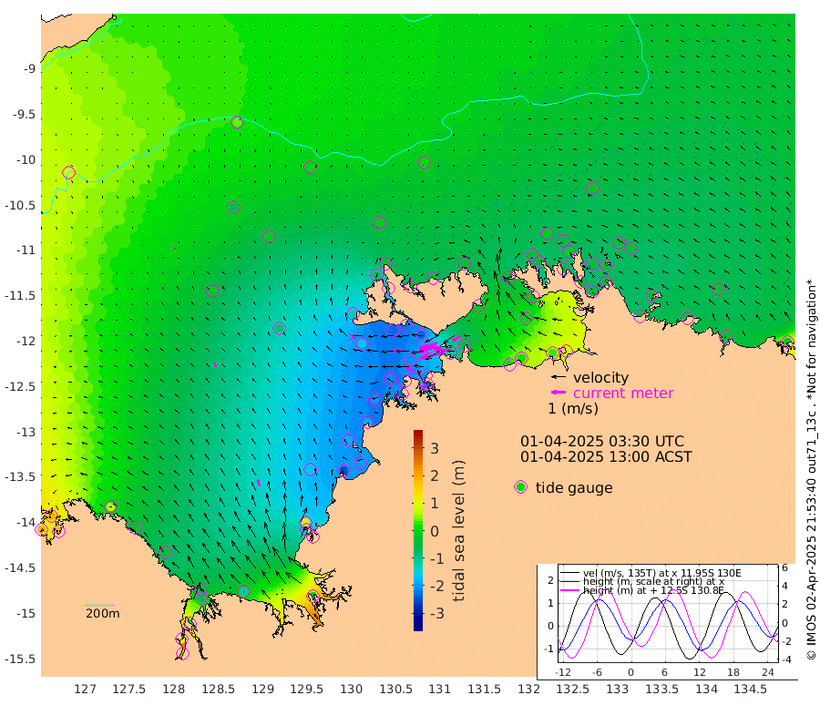 175cm/s -102T +4cm/s rms + 6cm/s 51T. Darwin_C1 52m 120cm/s -89T +4cm/s rms + 7cm/s -161T. Darwin_CW1 22m 131cm/s -108T +4cm/s rms + 8cm/s 61T. Darwin_CW2 34m 64cm/s -123T +3cm/s rms + 9cm/s 98T. Darwin_CW3 22m 159cm/s -92T +5cm/s rms + 7cm/s 88T. Darwin_C3 56m 100cm/s -115T +2cm/s rms + 9cm/s -126T. Darwin_CTbW 22m 0cm/s -53T +9cm/s rms + 2cm/s -110T. NWSLYN 196m 77cm/s -92T +1cm/s rms + 1cm/s -47T. DARBGF 30m 0cm/s -41T +7cm/s rms + 2cm/s -137T. ITFTIS 464m 13cm/s 8T +9cm/s rms + 1cm/s 74T. ITFMHB 146m 48cm/s -17T +4cm/s rms + 1cm/s -134T. ITFJBG 61m 32cm/s -31T +6cm/s rms + 4cm/s 121T. ITFFTB 108m 68cm/s -64T +4cm/s rms + 3cm/s 80T. NRSDAR 19m 181cm Carronade Island 188cm Guy Point 183cm Napier Broome Bay 70cm Lesueur Island -52cm Reveley Island -26cm Rocky Island -72cm Cape Domett -58cm Lacrosse Island -14cm Adolphus Island 103cm Pender Point 172cm Wyndham -15cm The Boxers -58cm Unnamed Shoal 43cm Loxton Shoal -116cm Pelican Island -19cm Calder Shoal 11cm Evans Shoal 0cm Quoin Island -171cm Port Keats -178cm Jones Point 118cm Catfish Island -164cm Cape Scott Offshore -252cm Cape Ford -201cm Anson Bay -21cm Goodrich Bank -185cm Peron Island North -190cm Point Jenny -192cm Native Point -204cm Fish Reef -212cm Tapa Bay -120cm Point Fawcett (Offshore) -221cm Burge Point -235cm Munkunuwa -165cm Beagle A -227cm Parsons Bank -205cm Fenton Patches 1cm Lynedoch Bank -197cm Hancox Shoal Area -211cm Nightcliff -228cm Darwin -213cm Charles Point Patches -108cm Glyde Point 1cm Chambers Bay 20cm Point Stuart -64cm Cape Hotham 6cm Christine Reef 32cm West Alligator Head 85cm East Field Island -16cm Two Hills Bay -82cm Newby Shoal -15cm Camp Point -217cm Medina Inlet South -117cm South Barlow Point -78cm St. Asaph Bay -33cm Cape Van Dieman -41cm Snake Bay -23cm Cache Point 83cm Echo Shoal -31cm Point Jahleel (Off) -50cm Cape Don -42cm Port Essington -42cm Smith Point - West -34cm NW Peacock Island -20cm North Of Jones Shoal -9cm Peacock Island -45cm Point David -45cm D'urville Point -20cm Money Shoal -43cm Copeland Island -54cm Cape Cockburn -40cm One Tree Point -38cm Hogmany Shoal -33cm New Year Island - West -40cm Grant Island -42cm Aurari Bay -37cm Cuthbert Point -45cm North Goulburn Island -32cm Paxie Shoal -37cm Entrance Island -22cm Yabooma Island