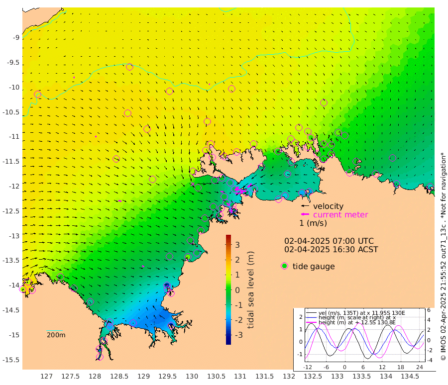 97cm/s -100T +4cm/s rms + 6cm/s 51T. Darwin_C1 52m 76cm/s -92T +4cm/s rms + 7cm/s -161T. Darwin_CW1 22m 40cm/s -107T +4cm/s rms + 8cm/s 61T. Darwin_CW2 34m 68cm/s -135T +3cm/s rms + 9cm/s 98T. Darwin_CW3 22m 87cm/s -90T +5cm/s rms + 7cm/s 88T. Darwin_C3 56m 46cm/s -116T +2cm/s rms + 9cm/s -126T. Darwin_CTbW 22m 11cm/s 141T +9cm/s rms + 2cm/s -110T. NWSLYN 196m 41cm/s 101T +1cm/s rms + 1cm/s -47T. DARBGF 30m 15cm/s 56T +7cm/s rms + 2cm/s -137T. ITFTIS 464m 17cm/s 93T +9cm/s rms + 1cm/s 74T. ITFMHB 146m 29cm/s 117T +4cm/s rms + 1cm/s -134T. ITFJBG 61m 41cm/s 109T +6cm/s rms + 4cm/s 121T. ITFFTB 108m 47cm/s 134T +4cm/s rms + 3cm/s 80T. NRSDAR 19m 70cm Carronade Island 64cm Guy Point 72cm Napier Broome Bay 20cm Lesueur Island -103cm Reveley Island -52cm Rocky Island -181cm Cape Domett -151cm Lacrosse Island -222cm Adolphus Island -237cm Pender Point -240cm Wyndham 97cm The Boxers 94cm Unnamed Shoal 128cm Loxton Shoal -191cm Pelican Island 113cm Calder Shoal 112cm Evans Shoal -304cm Quoin Island -127cm Port Keats -132cm Jones Point -273cm Catfish Island -42cm Cape Scott Offshore 38cm Cape Ford -47cm Anson Bay 112cm Goodrich Bank -26cm Peron Island North -14cm Point Jenny -10cm Native Point -22cm Fish Reef -36cm Tapa Bay 70cm Point Fawcett (Offshore) -53cm Burge Point -35cm Munkunuwa 22cm Beagle A -69cm Parsons Bank -40cm Fenton Patches 105cm Lynedoch Bank -78cm Hancox Shoal Area -70cm Nightcliff -80cm Darwin -38cm Charles Point Patches -91cm Glyde Point -138cm Chambers Bay -156cm Point Stuart -100cm Cape Hotham -125cm Christine Reef -181cm West Alligator Head -195cm East Field Island -103cm Two Hills Bay 70cm Newby Shoal -88cm Camp Point -32cm Medina Inlet South 80cm South Barlow Point 98cm St. Asaph Bay 113cm Cape Van Dieman 110cm Snake Bay 105cm Cache Point 132cm Echo Shoal 74cm Point Jahleel (Off) 12cm Cape Don 66cm Port Essington 66cm Smith Point - West 64cm NW Peacock Island 85cm North Of Jones Shoal 27cm Peacock Island 27cm Point David 61cm D'urville Point 66cm Money Shoal 19cm Copeland Island 27cm Cape Cockburn 33cm One Tree Point 16cm Hogmany Shoal 34cm New Year Island - West 23cm Grant Island -7cm Aurari Bay -39cm Cuthbert Point -4cm North Goulburn Island -59cm Paxie Shoal -89cm Entrance Island -136cm Yabooma Island