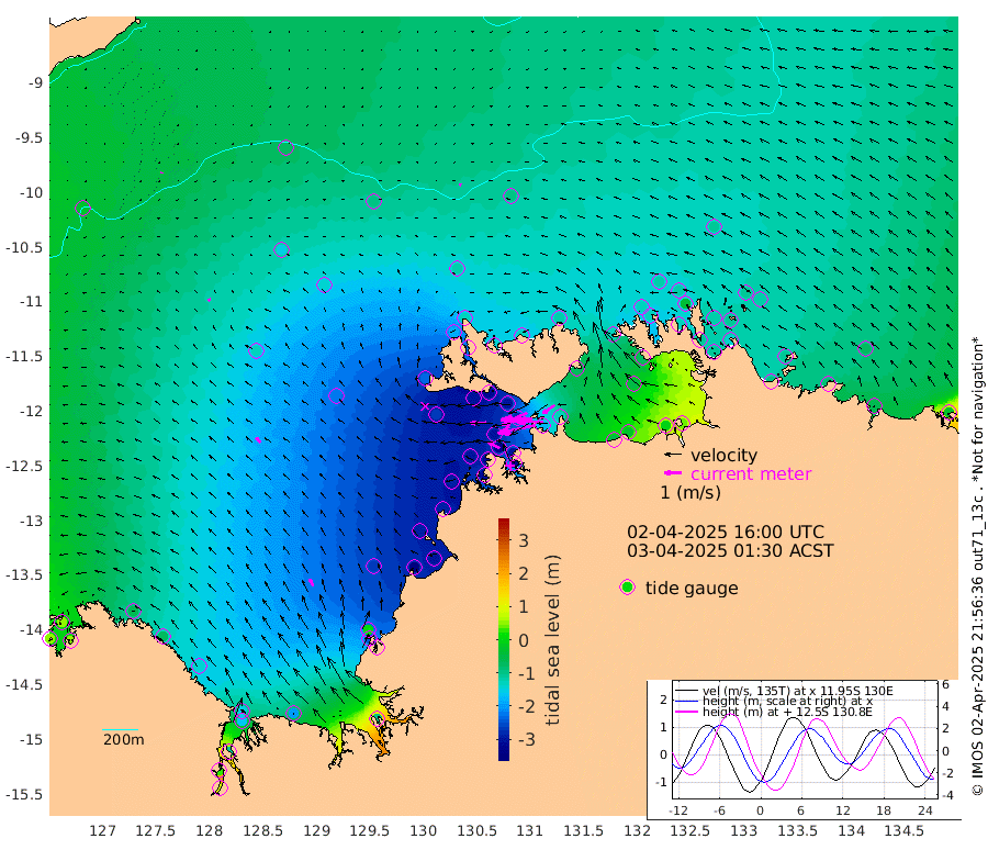225cm/s -102T +4cm/s rms + 6cm/s 51T. Darwin_C1 52m 156cm/s -89T +4cm/s rms + 7cm/s -161T. Darwin_CW1 22m 143cm/s -108T +4cm/s rms + 8cm/s 61T. Darwin_CW2 34m 83cm/s -125T +3cm/s rms + 9cm/s 98T. Darwin_CW3 22m 185cm/s -92T +5cm/s rms + 7cm/s 88T. Darwin_C3 56m 130cm/s -115T +2cm/s rms + 9cm/s -126T. Darwin_CTbW 22m 10cm/s -62T +9cm/s rms + 2cm/s -110T. NWSLYN 196m 92cm/s -93T +1cm/s rms + 1cm/s -47T. DARBGF 30m 7cm/s -151T +7cm/s rms + 2cm/s -137T. ITFTIS 464m 15cm/s -18T +9cm/s rms + 1cm/s 74T. ITFMHB 146m 47cm/s -20T +4cm/s rms + 1cm/s -134T. ITFJBG 61m 38cm/s -47T +6cm/s rms + 4cm/s 121T. ITFFTB 108m 75cm/s -63T +4cm/s rms + 3cm/s 80T. NRSDAR 19m 51cm Carronade Island 52cm Guy Point 52cm Napier Broome Bay -66cm Lesueur Island -136cm Reveley Island -68cm Rocky Island -164cm Cape Domett -155cm Lacrosse Island -109cm Adolphus Island 26cm Pender Point 81cm Wyndham -133cm The Boxers -150cm Unnamed Shoal -74cm Loxton Shoal -196cm Pelican Island -136cm Calder Shoal -93cm Evans Shoal -91cm Quoin Island -265cm Port Keats -244cm Jones Point 9cm Catfish Island -261cm Cape Scott Offshore -384cm Cape Ford -293cm Anson Bay -118cm Goodrich Bank -285cm Peron Island North -286cm Point Jenny -286cm Native Point -299cm Fish Reef -305cm Tapa Bay -232cm Point Fawcett (Offshore) -311cm Burge Point -303cm Munkunuwa -269cm Beagle A -301cm Parsons Bank -296cm Fenton Patches -91cm Lynedoch Bank -277cm Hancox Shoal Area -298cm Nightcliff -318cm Darwin -321cm Charles Point Patches -179cm Glyde Point -52cm Chambers Bay -25cm Point Stuart -126cm Cape Hotham -55cm Christine Reef -11cm West Alligator Head 44cm East Field Island -76cm Two Hills Bay -220cm Newby Shoal -77cm Camp Point -309cm Medina Inlet South -217cm South Barlow Point -183cm St. Asaph Bay -128cm Cape Van Dieman -137cm Snake Bay -126cm Cache Point -31cm Echo Shoal -122cm Point Jahleel (Off) -132cm Cape Don -129cm Port Essington -131cm Smith Point - West -120cm NW Peacock Island -117cm North Of Jones Shoal -41cm Peacock Island -107cm Point David -128cm D'urville Point -104cm Money Shoal -102cm Copeland Island -140cm Cape Cockburn -113cm One Tree Point -121cm Hogmany Shoal -106cm New Year Island - West -110cm Grant Island -93cm Aurari Bay -88cm Cuthbert Point -105cm North Goulburn Island -75cm Paxie Shoal -62cm Entrance Island -32cm Yabooma Island