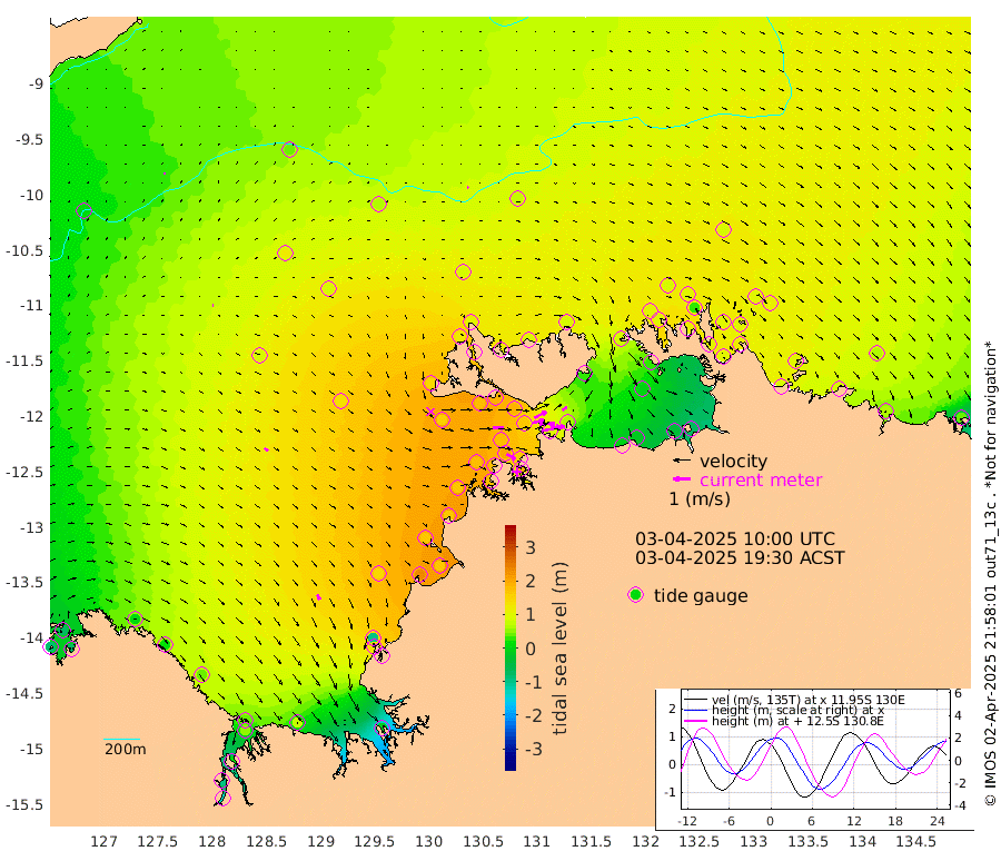 122cm/s 79T +4cm/s rms + 6cm/s 51T. Darwin_C1 52m 81cm/s 85T +4cm/s rms + 7cm/s -161T. Darwin_CW1 22m 68cm/s 75T +4cm/s rms + 8cm/s 61T. Darwin_CW2 34m 33cm/s 58T +3cm/s rms + 9cm/s 98T. Darwin_CW3 22m 87cm/s 88T +5cm/s rms + 7cm/s 88T. Darwin_C3 56m 78cm/s 62T +2cm/s rms + 9cm/s -126T. Darwin_CTbW 22m 6cm/s 111T +9cm/s rms + 2cm/s -110T. NWSLYN 196m 61cm/s 90T +1cm/s rms + 1cm/s -47T. DARBGF 30m 9cm/s 20T +7cm/s rms + 2cm/s -137T. ITFTIS 464m 6cm/s 74T +9cm/s rms + 1cm/s 74T. ITFMHB 146m 34cm/s 155T +4cm/s rms + 1cm/s -134T. ITFJBG 61m 25cm/s 125T +6cm/s rms + 4cm/s 121T. ITFFTB 108m 57cm/s 119T +4cm/s rms + 3cm/s 80T. NRSDAR 19m -78cm Carronade Island -85cm Guy Point -77cm Napier Broome Bay 9cm Lesueur Island 39cm Reveley Island 13cm Rocky Island 48cm Cape Domett 41cm Lacrosse Island 10cm Adolphus Island -93cm Pender Point -134cm Wyndham 81cm The Boxers 114cm Unnamed Shoal 45cm Loxton Shoal 76cm Pelican Island 82cm Calder Shoal 60cm Evans Shoal -18cm Quoin Island 132cm Port Keats 128cm Jones Point -98cm Catfish Island 141cm Cape Scott Offshore 231cm Cape Ford 168cm Anson Bay 87cm Goodrich Bank 167cm Peron Island North 161cm Point Jenny 164cm Native Point 175cm Fish Reef 175cm Tapa Bay 142cm Point Fawcett (Offshore) 179cm Burge Point 178cm Munkunuwa 157cm Beagle A 181cm Parsons Bank 170cm Fenton Patches 70cm Lynedoch Bank 159cm Hancox Shoal Area 166cm Nightcliff 190cm Darwin 195cm Charles Point Patches 95cm Glyde Point -6cm Chambers Bay -22cm Point Stuart 58cm Cape Hotham -6cm Christine Reef -39cm West Alligator Head -79cm East Field Island 23cm Two Hills Bay 129cm Newby Shoal 28cm Camp Point 184cm Medina Inlet South 145cm South Barlow Point 119cm St. Asaph Bay 94cm Cape Van Dieman 105cm Snake Bay 88cm Cache Point 11cm Echo Shoal 84cm Point Jahleel (Off) 85cm Cape Don 99cm Port Essington 97cm Smith Point - West 94cm NW Peacock Island 88cm North Of Jones Shoal 32cm Peacock Island 96cm Point David 101cm D'urville Point 89cm Money Shoal 92cm Copeland Island 120cm Cape Cockburn 96cm One Tree Point 102cm Hogmany Shoal 94cm New Year Island - West 96cm Grant Island 87cm Aurari Bay 80cm Cuthbert Point 92cm North Goulburn Island 66cm Paxie Shoal 58cm Entrance Island 36cm Yabooma Island
