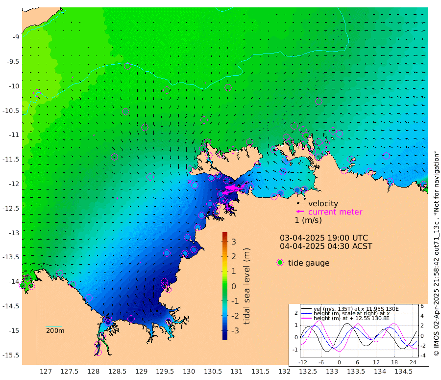 229cm/s -101T +4cm/s rms + 6cm/s 51T. Darwin_C1 52m 166cm/s -91T +4cm/s rms + 7cm/s -161T. Darwin_CW1 22m 95cm/s -105T +4cm/s rms + 8cm/s 61T. Darwin_CW2 34m 116cm/s -135T +3cm/s rms + 9cm/s 98T. Darwin_CW3 22m 164cm/s -90T +5cm/s rms + 7cm/s 88T. Darwin_C3 56m 131cm/s -115T +2cm/s rms + 9cm/s -126T. Darwin_CTbW 22m 6cm/s -138T +9cm/s rms + 2cm/s -110T. NWSLYN 196m 12cm/s -131T +1cm/s rms + 1cm/s -47T. DARBGF 30m 10cm/s 117T +7cm/s rms + 2cm/s -137T. ITFTIS 464m 10cm/s 126T +9cm/s rms + 1cm/s 74T. ITFMHB 146m 15cm/s 93T +4cm/s rms + 1cm/s -134T. ITFJBG 61m 23cm/s 115T +6cm/s rms + 4cm/s 121T. ITFFTB 108m 12cm/s -172T +4cm/s rms + 3cm/s 80T. NRSDAR 19m -11cm Carronade Island -13cm Guy Point -18cm Napier Broome Bay -117cm Lesueur Island -210cm Reveley Island -107cm Rocky Island -310cm Cape Domett -279cm Lacrosse Island -330cm Adolphus Island -283cm Pender Point -279cm Wyndham -53cm The Boxers -65cm Unnamed Shoal 15cm Loxton Shoal -323cm Pelican Island -28cm Calder Shoal 0cm Evans Shoal -394cm Quoin Island -301cm Port Keats -287cm Jones Point -363cm Catfish Island -212cm Cape Scott Offshore -210cm Cape Ford -231cm Anson Bay -14cm Goodrich Bank -215cm Peron Island North -198cm Point Jenny -194cm Native Point -215cm Fish Reef -225cm Tapa Bay -105cm Point Fawcett (Offshore) -247cm Burge Point -199cm Munkunuwa -165cm Beagle A -249cm Parsons Bank -230cm Fenton Patches -8cm Lynedoch Bank -249cm Hancox Shoal Area -250cm Nightcliff -279cm Darwin -250cm Charles Point Patches -230cm Glyde Point -212cm Chambers Bay -220cm Point Stuart -212cm Cape Hotham -201cm Christine Reef -236cm West Alligator Head -230cm East Field Island -196cm Two Hills Bay -131cm Newby Shoal -182cm Camp Point -224cm Medina Inlet South -84cm South Barlow Point -51cm St. Asaph Bay -16cm Cape Van Dieman -27cm Snake Bay -30cm Cache Point 42cm Echo Shoal -52cm Point Jahleel (Off) -118cm Cape Don -68cm Port Essington -67cm Smith Point - West -67cm NW Peacock Island -46cm North Of Jones Shoal -19cm Peacock Island -96cm Point David -73cm D'urville Point -63cm Money Shoal -98cm Copeland Island -135cm Cape Cockburn -96cm One Tree Point -132cm Hogmany Shoal -98cm New Year Island - West -107cm Grant Island -123cm Aurari Bay -157cm Cuthbert Point -130cm North Goulburn Island -166cm Paxie Shoal -179cm Entrance Island -204cm Yabooma Island