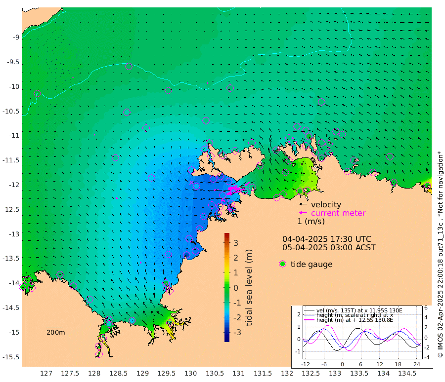193cm/s -102T +4cm/s rms + 6cm/s 51T. Darwin_C1 52m 131cm/s -89T +4cm/s rms + 7cm/s -161T. Darwin_CW1 22m 111cm/s -107T +4cm/s rms + 8cm/s 61T. Darwin_CW2 34m 73cm/s -125T +3cm/s rms + 9cm/s 98T. Darwin_CW3 22m 154cm/s -91T +5cm/s rms + 7cm/s 88T. Darwin_C3 56m 110cm/s -115T +2cm/s rms + 9cm/s -126T. Darwin_CTbW 22m 9cm/s -59T +9cm/s rms + 2cm/s -110T. NWSLYN 196m 63cm/s -94T +1cm/s rms + 1cm/s -47T. DARBGF 30m 5cm/s -149T +7cm/s rms + 2cm/s -137T. ITFTIS 464m 11cm/s -14T +9cm/s rms + 1cm/s 74T. ITFMHB 146m 27cm/s -18T +4cm/s rms + 1cm/s -134T. ITFJBG 61m 23cm/s -46T +6cm/s rms + 4cm/s 121T. ITFFTB 108m 48cm/s -66T +4cm/s rms + 3cm/s 80T. NRSDAR 19m 14cm Carronade Island 11cm Guy Point 7cm Napier Broome Bay -68cm Lesueur Island -117cm Reveley Island -73cm Rocky Island -143cm Cape Domett -133cm Lacrosse Island -107cm Adolphus Island -25cm Pender Point 13cm Wyndham -111cm The Boxers -118cm Unnamed Shoal -76cm Loxton Shoal -159cm Pelican Island -113cm Calder Shoal -84cm Evans Shoal -112cm Quoin Island -202cm Port Keats -180cm Jones Point -41cm Catfish Island -199cm Cape Scott Offshore -253cm Cape Ford -220cm Anson Bay -95cm Goodrich Bank -213cm Peron Island North -204cm Point Jenny -205cm Native Point -214cm Fish Reef -220cm Tapa Bay -175cm Point Fawcett (Offshore) -221cm Burge Point -221cm Munkunuwa -188cm Beagle A -219cm Parsons Bank -206cm Fenton Patches -79cm Lynedoch Bank -202cm Hancox Shoal Area -216cm Nightcliff -234cm Darwin -235cm Charles Point Patches -134cm Glyde Point -45cm Chambers Bay -28cm Point Stuart -97cm Cape Hotham -48cm Christine Reef -20cm West Alligator Head 20cm East Field Island -66cm Two Hills Bay -166cm Newby Shoal -62cm Camp Point -228cm Medina Inlet South -164cm South Barlow Point -140cm St. Asaph Bay -101cm Cape Van Dieman -111cm Snake Bay -100cm Cache Point -42cm Echo Shoal -97cm Point Jahleel (Off) -104cm Cape Don -101cm Port Essington -101cm Smith Point - West -93cm NW Peacock Island -97cm North Of Jones Shoal -34cm Peacock Island -82cm Point David -98cm D'urville Point -81cm Money Shoal -77cm Copeland Island -107cm Cape Cockburn -90cm One Tree Point -93cm Hogmany Shoal -82cm New Year Island - West -85cm Grant Island -68cm Aurari Bay -65cm Cuthbert Point -79cm North Goulburn Island -60cm Paxie Shoal -39cm Entrance Island -13cm Yabooma Island