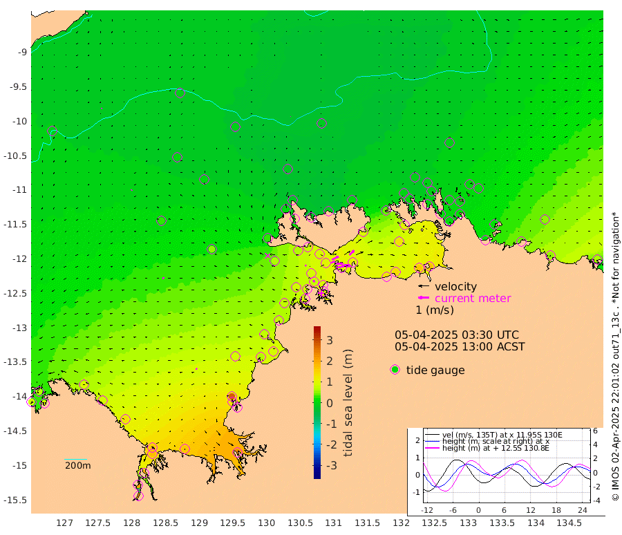 114cm/s 79T +4cm/s rms + 6cm/s 51T. Darwin_C1 52m 82cm/s 91T +4cm/s rms + 7cm/s -161T. Darwin_CW1 22m 41cm/s 71T +4cm/s rms + 8cm/s 61T. Darwin_CW2 34m 62cm/s 48T +3cm/s rms + 9cm/s 98T. Darwin_CW3 22m 66cm/s 91T +5cm/s rms + 7cm/s 88T. Darwin_C3 56m 67cm/s 66T +2cm/s rms + 9cm/s -126T. Darwin_CTbW 22m 2cm/s 6T +9cm/s rms + 2cm/s -110T. NWSLYN 196m 11cm/s -62T +1cm/s rms + 1cm/s -47T. DARBGF 30m 5cm/s -118T +7cm/s rms + 2cm/s -137T. ITFTIS 464m 8cm/s -136T +9cm/s rms + 1cm/s 74T. ITFMHB 146m 11cm/s -56T +4cm/s rms + 1cm/s -134T. ITFJBG 61m 13cm/s -72T +6cm/s rms + 4cm/s 121T. ITFFTB 108m 22cm/s -46T +4cm/s rms + 3cm/s 80T. NRSDAR 19m 77cm Carronade Island 80cm Guy Point 83cm Napier Broome Bay 93cm Lesueur Island 127cm Reveley Island 86cm Rocky Island 177cm Cape Domett 168cm Lacrosse Island 189cm Adolphus Island 211cm Pender Point 225cm Wyndham 23cm The Boxers 10cm Unnamed Shoal -8cm Loxton Shoal 167cm Pelican Island 8cm Calder Shoal -9cm Evans Shoal 233cm Quoin Island 138cm Port Keats 129cm Jones Point 281cm Catfish Island 89cm Cape Scott Offshore 58cm Cape Ford 86cm Anson Bay -16cm Goodrich Bank 77cm Peron Island North 77cm Point Jenny 73cm Native Point 79cm Fish Reef 82cm Tapa Bay 30cm Point Fawcett (Offshore) 92cm Burge Point 66cm Munkunuwa 61cm Beagle A 82cm Parsons Bank 88cm Fenton Patches -16cm Lynedoch Bank 91cm Hancox Shoal Area 97cm Nightcliff 95cm Darwin 78cm Charles Point Patches 104cm Glyde Point 133cm Chambers Bay 143cm Point Stuart 106cm Cape Hotham 128cm Christine Reef 161cm West Alligator Head 172cm East Field Island 111cm Two Hills Bay 53cm Newby Shoal 98cm Camp Point 75cm Medina Inlet South 5cm South Barlow Point 1cm St. Asaph Bay -17cm Cape Van Dieman -19cm Snake Bay -6cm Cache Point -8cm Echo Shoal 6cm Point Jahleel (Off) 40cm Cape Don -1cm Port Essington 1cm Smith Point - West -2cm NW Peacock Island -7cm North Of Jones Shoal -3cm Peacock Island 2cm Point David -3cm D'urville Point -8cm Money Shoal 4cm Copeland Island 12cm Cape Cockburn 5cm One Tree Point 18cm Hogmany Shoal 7cm New Year Island - West 9cm Grant Island 17cm Aurari Bay 36cm Cuthbert Point 21cm North Goulburn Island 46cm Paxie Shoal 51cm Entrance Island 63cm Yabooma Island