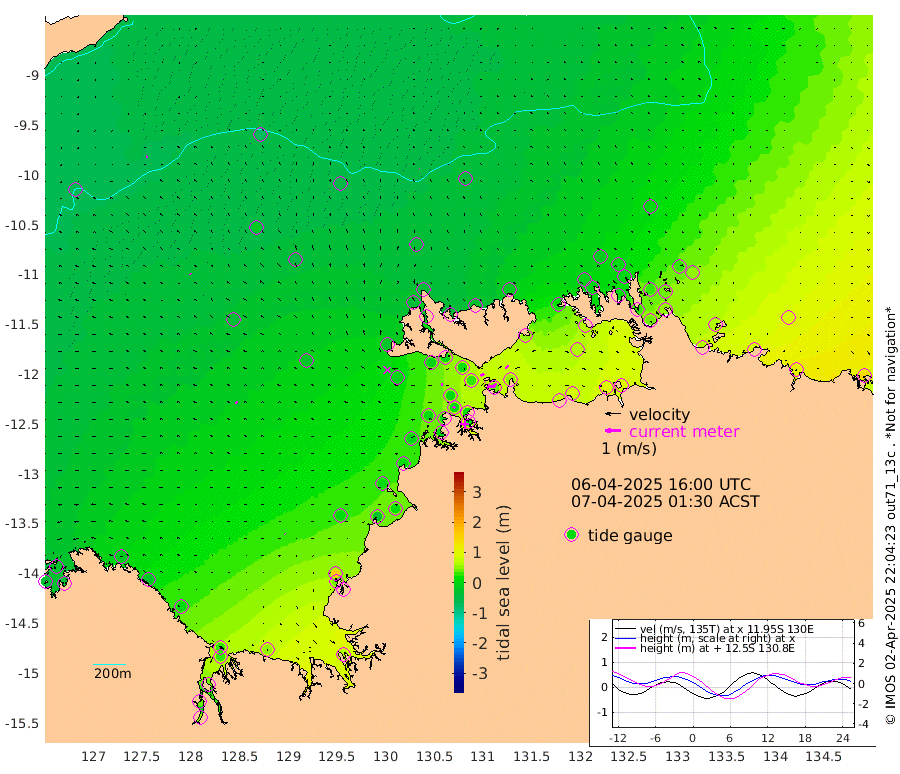 45cm/s 79T +4cm/s rms + 6cm/s 51T. Darwin_C1 52m 12cm/s 80T +4cm/s rms + 7cm/s -161T. Darwin_CW1 22m 1cm/s 3T +4cm/s rms + 8cm/s 61T. Darwin_CW2 34m 29cm/s 43T +3cm/s rms + 9cm/s 98T. Darwin_CW3 22m 4cm/s -109T +5cm/s rms + 7cm/s 88T. Darwin_C3 56m 26cm/s 63T +2cm/s rms + 9cm/s -126T. Darwin_CTbW 22m 2cm/s -47T +9cm/s rms + 2cm/s -110T. NWSLYN 196m 12cm/s -88T +1cm/s rms + 1cm/s -47T. DARBGF 30m 6cm/s -103T +7cm/s rms + 2cm/s -137T. ITFTIS 464m 8cm/s -42T +9cm/s rms + 1cm/s 74T. ITFMHB 146m 3cm/s -68T +4cm/s rms + 1cm/s -134T. ITFJBG 61m 11cm/s -70T +6cm/s rms + 4cm/s 121T. ITFFTB 108m 17cm/s -53T +4cm/s rms + 3cm/s 80T. NRSDAR 19m -29cm Carronade Island -35cm Guy Point -34cm Napier Broome Bay -14cm Lesueur Island 11cm Reveley Island -23cm Rocky Island 32cm Cape Domett 28cm Lacrosse Island 44cm Adolphus Island 39cm Pender Point 51cm Wyndham -40cm The Boxers -22cm Unnamed Shoal -68cm Loxton Shoal 48cm Pelican Island -54cm Calder Shoal -50cm Evans Shoal 67cm Quoin Island 23cm Port Keats 40cm Jones Point 157cm Catfish Island 5cm Cape Scott Offshore -32cm Cape Ford 11cm Anson Bay -42cm Goodrich Bank 10cm Peron Island North 2cm Point Jenny -3cm Native Point 11cm Fish Reef 5cm Tapa Bay -24cm Point Fawcett (Offshore) 10cm Burge Point -7cm Munkunuwa -9cm Beagle A 21cm Parsons Bank 9cm Fenton Patches -40cm Lynedoch Bank 24cm Hancox Shoal Area 15cm Nightcliff 21cm Darwin 8cm Charles Point Patches 42cm Glyde Point 72cm Chambers Bay 84cm Point Stuart 55cm Cape Hotham 58cm Christine Reef 92cm West Alligator Head 99cm East Field Island 62cm Two Hills Bay -29cm Newby Shoal 45cm Camp Point 1cm Medina Inlet South -34cm South Barlow Point -41cm St. Asaph Bay -40cm Cape Van Dieman -39cm Snake Bay -30cm Cache Point -64cm Echo Shoal -19cm Point Jahleel (Off) 17cm Cape Don -1cm Port Essington -1cm Smith Point - West 3cm NW Peacock Island -12cm North Of Jones Shoal -1cm Peacock Island 33cm Point David 8cm D'urville Point 7cm Money Shoal 39cm Copeland Island 52cm Cape Cockburn 28cm One Tree Point 50cm Hogmany Shoal 30cm New Year Island - West 34cm Grant Island 61cm Aurari Bay 81cm Cuthbert Point 58cm North Goulburn Island 83cm Paxie Shoal 103cm Entrance Island 136cm Yabooma Island