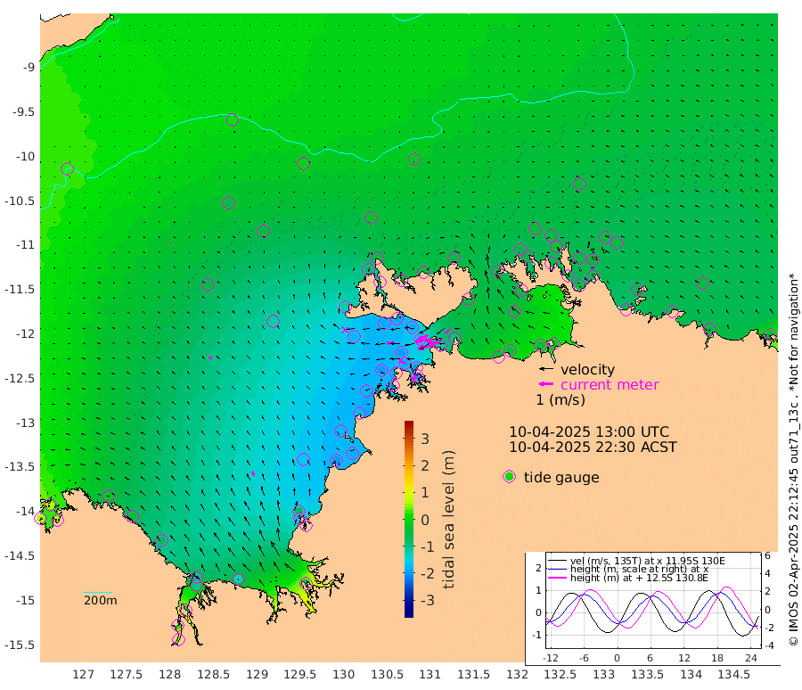 126cm/s -102T +4cm/s rms + 6cm/s 51T. Darwin_C1 52m 100cm/s -89T +4cm/s rms + 7cm/s -161T. Darwin_CW1 22m 84cm/s -107T +4cm/s rms + 8cm/s 61T. Darwin_CW2 34m 48cm/s -132T +3cm/s rms + 9cm/s 98T. Darwin_CW3 22m 110cm/s -91T +5cm/s rms + 7cm/s 88T. Darwin_C3 56m 74cm/s -115T +2cm/s rms + 9cm/s -126T. Darwin_CTbW 22m 2cm/s -176T +9cm/s rms + 2cm/s -110T. NWSLYN 196m 59cm/s -91T +1cm/s rms + 1cm/s -47T. DARBGF 30m 1cm/s -150T +7cm/s rms + 2cm/s -137T. ITFTIS 464m 10cm/s -5T +9cm/s rms + 1cm/s 74T. ITFMHB 146m 35cm/s -20T +4cm/s rms + 1cm/s -134T. ITFJBG 61m 25cm/s -40T +6cm/s rms + 4cm/s 121T. ITFFTB 108m 53cm/s -62T +4cm/s rms + 3cm/s 80T. NRSDAR 19m 63cm Carronade Island 72cm Guy Point 71cm Napier Broome Bay -20cm Lesueur Island -78cm Reveley Island -39cm Rocky Island -106cm Cape Domett -106cm Lacrosse Island -77cm Adolphus Island 23cm Pender Point 49cm Wyndham -45cm The Boxers -63cm Unnamed Shoal 12cm Loxton Shoal -134cm Pelican Island -42cm Calder Shoal -10cm Evans Shoal -76cm Quoin Island -172cm Port Keats -167cm Jones Point -78cm Catfish Island -159cm Cape Scott Offshore -201cm Cape Ford -184cm Anson Bay -30cm Goodrich Bank -172cm Peron Island North -175cm Point Jenny -173cm Native Point -193cm Fish Reef -185cm Tapa Bay -121cm Point Fawcett (Offshore) -197cm Burge Point -182cm Munkunuwa -170cm Beagle A -185cm Parsons Bank -197cm Fenton Patches -14cm Lynedoch Bank -173cm Hancox Shoal Area -196cm Nightcliff -198cm Darwin -190cm Charles Point Patches -123cm Glyde Point -61cm Chambers Bay -47cm Point Stuart -95cm Cape Hotham -53cm Christine Reef -44cm West Alligator Head -17cm East Field Island -63cm Two Hills Bay -116cm Newby Shoal -58cm Camp Point -187cm Medina Inlet South -103cm South Barlow Point -80cm St. Asaph Bay -37cm Cape Van Dieman -40cm Snake Bay -40cm Cache Point 26cm Echo Shoal -45cm Point Jahleel (Off) -66cm Cape Don -49cm Port Essington -53cm Smith Point - West -44cm NW Peacock Island -39cm North Of Jones Shoal -15cm Peacock Island -42cm Point David -51cm D'urville Point -34cm Money Shoal -43cm Copeland Island -64cm Cape Cockburn -46cm One Tree Point -42cm Hogmany Shoal -44cm New Year Island - West -43cm Grant Island -55cm Aurari Bay -50cm Cuthbert Point -52cm North Goulburn Island -40cm Paxie Shoal -47cm Entrance Island -46cm Yabooma Island