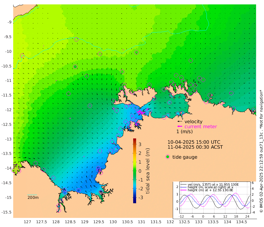 105cm/s -101T +4cm/s rms + 6cm/s 51T. Darwin_C1 52m 99cm/s -91T +4cm/s rms + 7cm/s -161T. Darwin_CW1 22m 65cm/s -106T +4cm/s rms + 8cm/s 61T. Darwin_CW2 34m 65cm/s -137T +3cm/s rms + 9cm/s 98T. Darwin_CW3 22m 112cm/s -91T +5cm/s rms + 7cm/s 88T. Darwin_C3 56m 48cm/s -116T +2cm/s rms + 9cm/s -126T. Darwin_CTbW 22m 11cm/s 162T +9cm/s rms + 2cm/s -110T. NWSLYN 196m 7cm/s -167T +1cm/s rms + 1cm/s -47T. DARBGF 30m 7cm/s 94T +7cm/s rms + 2cm/s -137T. ITFTIS 464m 9cm/s 119T +9cm/s rms + 1cm/s 74T. ITFMHB 146m 13cm/s 71T +4cm/s rms + 1cm/s -134T. ITFJBG 61m 18cm/s 112T +6cm/s rms + 4cm/s 121T. ITFFTB 108m 9cm/s 172T +4cm/s rms + 3cm/s 80T. NRSDAR 19m 45cm Carronade Island 50cm Guy Point 49cm Napier Broome Bay -48cm Lesueur Island -139cm Reveley Island -88cm Rocky Island -225cm Cape Domett -201cm Lacrosse Island -242cm Adolphus Island -194cm Pender Point -184cm Wyndham 0cm The Boxers -4cm Unnamed Shoal 56cm Loxton Shoal -234cm Pelican Island 16cm Calder Shoal 42cm Evans Shoal -288cm Quoin Island -223cm Port Keats -220cm Jones Point -228cm Catfish Island -138cm Cape Scott Offshore -178cm Cape Ford -153cm Anson Bay 28cm Goodrich Bank -142cm Peron Island North -134cm Point Jenny -132cm Native Point -158cm Fish Reef -155cm Tapa Bay -48cm Point Fawcett (Offshore) -187cm Burge Point -147cm Munkunuwa -121cm Beagle A -175cm Parsons Bank -180cm Fenton Patches 33cm Lynedoch Bank -171cm Hancox Shoal Area -180cm Nightcliff -202cm Darwin -174cm Charles Point Patches -160cm Glyde Point -141cm Chambers Bay -148cm Point Stuart -143cm Cape Hotham -129cm Christine Reef -161cm West Alligator Head -163cm East Field Island -120cm Two Hills Bay -72cm Newby Shoal -119cm Camp Point -159cm Medina Inlet South -35cm South Barlow Point -8cm St. Asaph Bay 27cm Cape Van Dieman 23cm Snake Bay 20cm Cache Point 69cm Echo Shoal 0cm Point Jahleel (Off) -49cm Cape Don -6cm Port Essington -3cm Smith Point - West 0cm NW Peacock Island 15cm North Of Jones Shoal 4cm Peacock Island -13cm Point David -4cm D'urville Point 4cm Money Shoal -17cm Copeland Island -31cm Cape Cockburn -15cm One Tree Point -21cm Hogmany Shoal -16cm New Year Island - West -19cm Grant Island -40cm Aurari Bay -57cm Cuthbert Point -37cm North Goulburn Island -60cm Paxie Shoal -82cm Entrance Island -104cm Yabooma Island