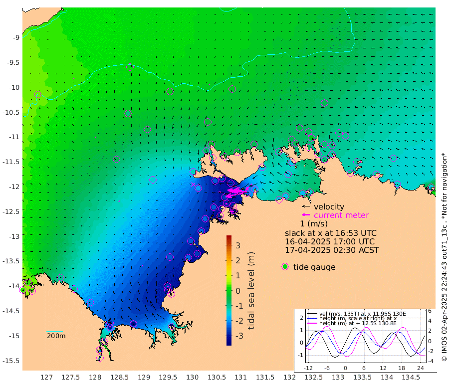 235cm/s -102T +4cm/s rms + 6cm/s 51T. Darwin_C1 52m 178cm/s -90T +4cm/s rms + 7cm/s -161T. Darwin_CW1 22m 124cm/s -107T +4cm/s rms + 8cm/s 61T. Darwin_CW2 34m 111cm/s -134T +3cm/s rms + 9cm/s 98T. Darwin_CW3 22m 189cm/s -90T +5cm/s rms + 7cm/s 88T. Darwin_C3 56m 137cm/s -115T +2cm/s rms + 9cm/s -126T. Darwin_CTbW 22m 6cm/s -143T +9cm/s rms + 2cm/s -110T. NWSLYN 196m 33cm/s -103T +1cm/s rms + 1cm/s -47T. DARBGF 30m 8cm/s 133T +7cm/s rms + 2cm/s -137T. ITFTIS 464m 8cm/s 127T +9cm/s rms + 1cm/s 74T. ITFMHB 146m 12cm/s 42T +4cm/s rms + 1cm/s -134T. ITFJBG 61m 12cm/s 106T +6cm/s rms + 4cm/s 121T. ITFFTB 108m 20cm/s -94T +4cm/s rms + 3cm/s 80T. NRSDAR 19m 33cm Carronade Island 29cm Guy Point 30cm Napier Broome Bay -106cm Lesueur Island -207cm Reveley Island -92cm Rocky Island -296cm Cape Domett -273cm Lacrosse Island -302cm Adolphus Island -223cm Pender Point -203cm Wyndham -63cm The Boxers -90cm Unnamed Shoal 6cm Loxton Shoal -320cm Pelican Island -45cm Calder Shoal -5cm Evans Shoal -361cm Quoin Island -318cm Port Keats -296cm Jones Point -263cm Catfish Island -242cm Cape Scott Offshore -225cm Cape Ford -270cm Anson Bay -29cm Goodrich Bank -237cm Peron Island North -225cm Point Jenny -226cm Native Point -238cm Fish Reef -262cm Tapa Bay -129cm Point Fawcett (Offshore) -273cm Burge Point -239cm Munkunuwa -194cm Beagle A -274cm Parsons Bank -261cm Fenton Patches -19cm Lynedoch Bank -275cm Hancox Shoal Area -290cm Nightcliff -309cm Darwin -283cm Charles Point Patches -226cm Glyde Point -174cm Chambers Bay -166cm Point Stuart -193cm Cape Hotham -163cm Christine Reef -175cm West Alligator Head -157cm East Field Island -159cm Two Hills Bay -145cm Newby Shoal -162cm Camp Point -258cm Medina Inlet South -114cm South Barlow Point -78cm St. Asaph Bay -32cm Cape Van Dieman -48cm Snake Bay -37cm Cache Point 37cm Echo Shoal -59cm Point Jahleel (Off) -109cm Cape Don -66cm Port Essington -66cm Smith Point - West -63cm NW Peacock Island -48cm North Of Jones Shoal -19cm Peacock Island -88cm Point David -70cm D'urville Point -57cm Money Shoal -88cm Copeland Island -113cm Cape Cockburn -86cm One Tree Point -110cm Hogmany Shoal -90cm New Year Island - West -95cm Grant Island -109cm Aurari Bay -121cm Cuthbert Point -109cm North Goulburn Island -135cm Paxie Shoal -138cm Entrance Island -150cm Yabooma Island
