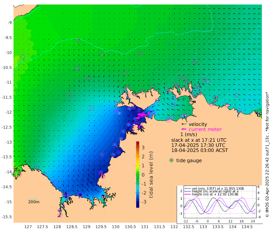 232cm/s -102T +4cm/s rms + 6cm/s 51T. Darwin_C1 52m 165cm/s -90T +4cm/s rms + 7cm/s -161T. Darwin_CW1 22m 115cm/s -107T +4cm/s rms + 8cm/s 61T. Darwin_CW2 34m 110cm/s -133T +3cm/s rms + 9cm/s 98T. Darwin_CW3 22m 173cm/s -90T +5cm/s rms + 7cm/s 88T. Darwin_C3 56m 135cm/s -115T +2cm/s rms + 9cm/s -126T. Darwin_CTbW 22m 6cm/s -130T +9cm/s rms + 2cm/s -110T. NWSLYN 196m 29cm/s -104T +1cm/s rms + 1cm/s -47T. DARBGF 30m 8cm/s 135T +7cm/s rms + 2cm/s -137T. ITFTIS 464m 7cm/s 129T +9cm/s rms + 1cm/s 74T. ITFMHB 146m 10cm/s 52T +4cm/s rms + 1cm/s -134T. ITFJBG 61m 12cm/s 109T +6cm/s rms + 4cm/s 121T. ITFFTB 108m 16cm/s -101T +4cm/s rms + 3cm/s 80T. NRSDAR 19m 17cm Carronade Island 12cm Guy Point 13cm Napier Broome Bay -108cm Lesueur Island -199cm Reveley Island -94cm Rocky Island -282cm Cape Domett -257cm Lacrosse Island -289cm Adolphus Island -219cm Pender Point -201cm Wyndham -67cm The Boxers -90cm Unnamed Shoal -2cm Loxton Shoal -303cm Pelican Island -48cm Calder Shoal -11cm Evans Shoal -339cm Quoin Island -300cm Port Keats -277cm Jones Point -242cm Catfish Island -226cm Cape Scott Offshore -216cm Cape Ford -251cm Anson Bay -33cm Goodrich Bank -221cm Peron Island North -213cm Point Jenny -214cm Native Point -220cm Fish Reef -247cm Tapa Bay -122cm Point Fawcett (Offshore) -255cm Burge Point -222cm Munkunuwa -183cm Beagle A -257cm Parsons Bank -245cm Fenton Patches -23cm Lynedoch Bank -260cm Hancox Shoal Area -271cm Nightcliff -289cm Darwin -265cm Charles Point Patches -213cm Glyde Point -166cm Chambers Bay -158cm Point Stuart -181cm Cape Hotham -160cm Christine Reef -166cm West Alligator Head -150cm East Field Island -152cm Two Hills Bay -142cm Newby Shoal -155cm Camp Point -240cm Medina Inlet South -109cm South Barlow Point -76cm St. Asaph Bay -36cm Cape Van Dieman -50cm Snake Bay -40cm Cache Point 29cm Echo Shoal -60cm Point Jahleel (Off) -106cm Cape Don -67cm Port Essington -68cm Smith Point - West -66cm NW Peacock Island -49cm North Of Jones Shoal -19cm Peacock Island -89cm Point David -72cm D'urville Point -59cm Money Shoal -88cm Copeland Island -112cm Cape Cockburn -85cm One Tree Point -113cm Hogmany Shoal -90cm New Year Island - West -96cm Grant Island -106cm Aurari Bay -121cm Cuthbert Point -107cm North Goulburn Island -132cm Paxie Shoal -136cm Entrance Island -143cm Yabooma Island