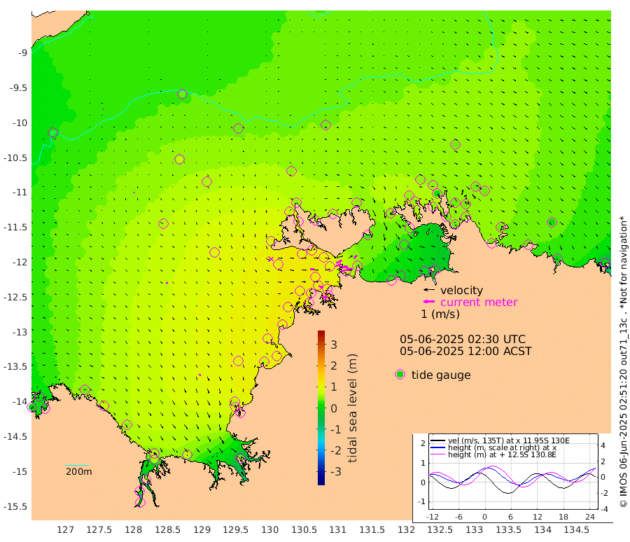 88cm/s 78T +4cm/s rms + 6cm/s 51T. Darwin_C1 52m 53cm/s 91T +4cm/s rms + 7cm/s -161T. Darwin_CW1 22m 54cm/s 73T +4cm/s rms + 8cm/s 61T. Darwin_CW2 34m 37cm/s 50T +3cm/s rms + 9cm/s 98T. Darwin_CW3 22m 75cm/s 89T +5cm/s rms + 7cm/s 88T. Darwin_C3 56m 54cm/s 65T +2cm/s rms + 9cm/s -126T. Darwin_CTbW 22m 1cm/s 97T +9cm/s rms + 2cm/s -110T. NWSLYN 196m 35cm/s 88T +1cm/s rms + 1cm/s -47T. DARBGF 30m 2cm/s 40T +7cm/s rms + 2cm/s -137T. ITFTIS 464m 6cm/s 159T +9cm/s rms + 1cm/s 74T. ITFMHB 146m 16cm/s 160T +4cm/s rms + 1cm/s -134T. ITFJBG 61m 14cm/s 136T +6cm/s rms + 4cm/s 121T. ITFFTB 108m 32cm/s 116T +4cm/s rms + 3cm/s 80T. NRSDAR 19m 3cm Carronade Island -4cm Guy Point 8cm Napier Broome Bay 39cm Lesueur Island 52cm Reveley Island 73cm Rocky Island 64cm Cape Domett 61cm Lacrosse Island 55cm Adolphus Island 2cm Pender Point -10cm Wyndham 64cm The Boxers 69cm Unnamed Shoal 37cm Loxton Shoal 70cm Pelican Island 58cm Calder Shoal 38cm Evans Shoal 46cm Quoin Island 99cm Port Keats 81cm Jones Point 61cm Catfish Island 95cm Cape Scott Offshore 78cm Cape Ford 106cm Anson Bay 47cm Goodrich Bank 100cm Peron Island North 102cm Point Jenny 103cm Native Point 108cm Fish Reef 104cm Tapa Bay 84cm Point Fawcett (Offshore) 107cm Burge Point 100cm Munkunuwa 104cm Beagle A 103cm Parsons Bank 110cm Fenton Patches 41cm Lynedoch Bank 95cm Hancox Shoal Area 110cm Nightcliff 110cm Darwin 109cm Charles Point Patches 68cm Glyde Point 32cm Chambers Bay 18cm Point Stuart 48cm Cape Hotham 31cm Christine Reef 15cm West Alligator Head -1cm East Field Island 37cm Two Hills Bay 99cm Newby Shoal 32cm Camp Point 109cm Medina Inlet South 82cm South Barlow Point 68cm St. Asaph Bay 50cm Cape Van Dieman 56cm Snake Bay 50cm Cache Point 25cm Echo Shoal 49cm Point Jahleel (Off) 55cm Cape Don 50cm Port Essington 54cm Smith Point - West 49cm NW Peacock Island 48cm North Of Jones Shoal 17cm Peacock Island 38cm Point David 52cm D'urville Point 40cm Money Shoal 35cm Copeland Island 53cm Cape Cockburn 43cm One Tree Point 36cm Hogmany Shoal 44cm New Year Island - West 42cm Grant Island 40cm Aurari Bay 36cm Cuthbert Point 41cm North Goulburn Island 21cm Paxie Shoal 22cm Entrance Island 3cm Yabooma Island