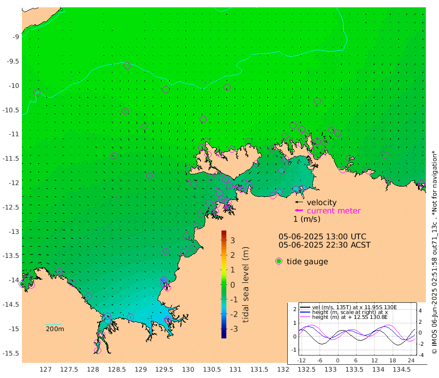 8cm/s -97T +4cm/s rms + 6cm/s 51T. Darwin_C1 52m 21cm/s -88T +4cm/s rms + 7cm/s -161T. Darwin_CW1 22m 14cm/s -106T +4cm/s rms + 8cm/s 61T. Darwin_CW2 34m 17cm/s -151T +3cm/s rms + 9cm/s 98T. Darwin_CW3 22m 35cm/s -88T +5cm/s rms + 7cm/s 88T. Darwin_C3 56m 2cm/s 50T +2cm/s rms + 9cm/s -126T. Darwin_CTbW 22m 8cm/s 159T +9cm/s rms + 2cm/s -110T. NWSLYN 196m 15cm/s 107T +1cm/s rms + 1cm/s -47T. DARBGF 30m 4cm/s 123T +7cm/s rms + 2cm/s -137T. ITFTIS 464m 7cm/s 158T +9cm/s rms + 1cm/s 74T. ITFMHB 146m 13cm/s 135T +4cm/s rms + 1cm/s -134T. ITFJBG 61m 16cm/s 133T +6cm/s rms + 4cm/s 121T. ITFFTB 108m 19cm/s 126T +4cm/s rms + 3cm/s 80T. NRSDAR 19m -47cm Carronade Island -41cm Guy Point -49cm Napier Broome Bay -74cm Lesueur Island -96cm Reveley Island -75cm Rocky Island -143cm Cape Domett -135cm Lacrosse Island -163cm Adolphus Island -166cm Pender Point -182cm Wyndham -17cm The Boxers -7cm Unnamed Shoal 11cm Loxton Shoal -129cm Pelican Island -5cm Calder Shoal 13cm Evans Shoal -192cm Quoin Island -111cm Port Keats -112cm Jones Point -202cm Catfish Island -60cm Cape Scott Offshore -83cm Cape Ford -59cm Anson Bay 13cm Goodrich Bank -61cm Peron Island North -57cm Point Jenny -55cm Native Point -73cm Fish Reef -60cm Tapa Bay -18cm Point Fawcett (Offshore) -88cm Burge Point -49cm Munkunuwa -61cm Beagle A -68cm Parsons Bank -87cm Fenton Patches 11cm Lynedoch Bank -70cm Hancox Shoal Area -76cm Nightcliff -87cm Darwin -72cm Charles Point Patches -91cm Glyde Point -104cm Chambers Bay -117cm Point Stuart -91cm Cape Hotham -99cm Christine Reef -129cm West Alligator Head -146cm East Field Island -88cm Two Hills Bay -56cm Newby Shoal -86cm Camp Point -64cm Medina Inlet South -6cm South Barlow Point 1cm St. Asaph Bay 15cm Cape Van Dieman 15cm Snake Bay 5cm Cache Point 7cm Echo Shoal -3cm Point Jahleel (Off) -30cm Cape Don -2cm Port Essington 1cm Smith Point - West 2cm NW Peacock Island 7cm North Of Jones Shoal 2cm Peacock Island 1cm Point David 3cm D'urville Point 2cm Money Shoal -1cm Copeland Island -13cm Cape Cockburn -4cm One Tree Point -6cm Hogmany Shoal -7cm New Year Island - West -6cm Grant Island -16cm Aurari Bay -28cm Cuthbert Point -14cm North Goulburn Island -29cm Paxie Shoal -45cm Entrance Island -59cm Yabooma Island