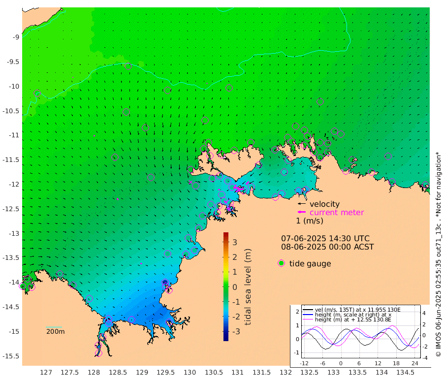 61cm/s -100T +4cm/s rms + 6cm/s 51T. Darwin_C1 52m 80cm/s -92T +4cm/s rms + 7cm/s -161T. Darwin_CW1 22m 28cm/s -104T +4cm/s rms + 8cm/s 61T. Darwin_CW2 34m 48cm/s -140T +3cm/s rms + 9cm/s 98T. Darwin_CW3 22m 71cm/s -89T +5cm/s rms + 7cm/s 88T. Darwin_C3 56m 22cm/s -115T +2cm/s rms + 9cm/s -126T. Darwin_CTbW 22m 8cm/s 173T +9cm/s rms + 2cm/s -110T. NWSLYN 196m 20cm/s 109T +1cm/s rms + 1cm/s -47T. DARBGF 30m 7cm/s 136T +7cm/s rms + 2cm/s -137T. ITFTIS 464m 15cm/s 162T +9cm/s rms + 1cm/s 74T. ITFMHB 146m 19cm/s 132T +4cm/s rms + 1cm/s -134T. ITFJBG 61m 26cm/s 133T +6cm/s rms + 4cm/s 121T. ITFFTB 108m 27cm/s 131T +4cm/s rms + 3cm/s 80T. NRSDAR 19m -36cm Carronade Island -31cm Guy Point -41cm Napier Broome Bay -91cm Lesueur Island -131cm Reveley Island -77cm Rocky Island -198cm Cape Domett -185cm Lacrosse Island -221cm Adolphus Island -221cm Pender Point -234cm Wyndham -22cm The Boxers -25cm Unnamed Shoal 15cm Loxton Shoal -187cm Pelican Island -5cm Calder Shoal 16cm Evans Shoal -278cm Quoin Island -166cm Port Keats -164cm Jones Point -276cm Catfish Island -99cm Cape Scott Offshore -100cm Cape Ford -104cm Anson Bay 12cm Goodrich Bank -99cm Peron Island North -82cm Point Jenny -80cm Native Point -105cm Fish Reef -95cm Tapa Bay -33cm Point Fawcett (Offshore) -125cm Burge Point -81cm Munkunuwa -78cm Beagle A -111cm Parsons Bank -118cm Fenton Patches 8cm Lynedoch Bank -112cm Hancox Shoal Area -117cm Nightcliff -139cm Darwin -118cm Charles Point Patches -131cm Glyde Point -137cm Chambers Bay -156cm Point Stuart -129cm Cape Hotham -127cm Christine Reef -170cm West Alligator Head -185cm East Field Island -123cm Two Hills Bay -68cm Newby Shoal -120cm Camp Point -103cm Medina Inlet South -19cm South Barlow Point -4cm St. Asaph Bay 13cm Cape Van Dieman 7cm Snake Bay 3cm Cache Point 18cm Echo Shoal -11cm Point Jahleel (Off) -51cm Cape Don -15cm Port Essington -9cm Smith Point - West -10cm NW Peacock Island -4cm North Of Jones Shoal -3cm Peacock Island -24cm Point David -10cm D'urville Point -14cm Money Shoal -25cm Copeland Island -45cm Cape Cockburn -29cm One Tree Point -36cm Hogmany Shoal -32cm New Year Island - West -31cm Grant Island -47cm Aurari Bay -62cm Cuthbert Point -45cm North Goulburn Island -73cm Paxie Shoal -80cm Entrance Island -102cm Yabooma Island