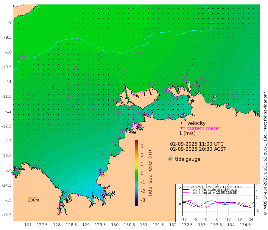 78cm/s -102T +4cm/s rms + 6cm/s 51T. Darwin_C1 52m 58cm/s -91T +4cm/s rms + 7cm/s -161T. Darwin_CW1 22m 20cm/s -104T +4cm/s rms + 8cm/s 61T. Darwin_CW2 34m 49cm/s -137T +3cm/s rms + 9cm/s 98T. Darwin_CW3 22m 38cm/s -87T +5cm/s rms + 7cm/s 88T. Darwin_C3 56m 53cm/s -115T +2cm/s rms + 9cm/s -126T. Darwin_CTbW 22m 3cm/s -117T +9cm/s rms + 2cm/s -110T. NWSLYN 196m 4cm/s 133T +1cm/s rms + 1cm/s -47T. DARBGF 30m 5cm/s 163T +7cm/s rms + 2cm/s -137T. ITFTIS 464m 8cm/s -180T +9cm/s rms + 1cm/s 74T. ITFMHB 146m 9cm/s 152T +4cm/s rms + 1cm/s -134T. ITFJBG 61m 9cm/s 147T +6cm/s rms + 4cm/s 121T. ITFFTB 108m 9cm/s 136T +4cm/s rms + 3cm/s 80T. NRSDAR 19m -73cm Carronade Island -73cm Guy Point -80cm Napier Broome Bay -101cm Lesueur Island -92cm Reveley Island -35cm Rocky Island -124cm Cape Domett -126cm Lacrosse Island -135cm Adolphus Island -143cm Pender Point -162cm Wyndham -45cm The Boxers -56cm Unnamed Shoal -13cm Loxton Shoal -125cm Pelican Island -28cm Calder Shoal -9cm Evans Shoal -169cm Quoin Island -101cm Port Keats -99cm Jones Point -243cm Catfish Island -82cm Cape Scott Offshore -15cm Cape Ford -86cm Anson Bay -13cm Goodrich Bank -68cm Peron Island North -66cm Point Jenny -64cm Native Point -65cm Fish Reef -74cm Tapa Bay -41cm Point Fawcett (Offshore) -69cm Burge Point -43cm Munkunuwa -58cm Beagle A -63cm Parsons Bank -73cm Fenton Patches -15cm Lynedoch Bank -78cm Hancox Shoal Area -85cm Nightcliff -82cm Darwin -77cm Charles Point Patches -90cm Glyde Point -110cm Chambers Bay -111cm Point Stuart -90cm Cape Hotham -98cm Christine Reef -120cm West Alligator Head -130cm East Field Island -92cm Two Hills Bay -60cm Newby Shoal -91cm Camp Point -64cm Medina Inlet South -23cm South Barlow Point -21cm St. Asaph Bay -13cm Cape Van Dieman -17cm Snake Bay -21cm Cache Point -18cm Echo Shoal -28cm Point Jahleel (Off) -51cm Cape Don -28cm Port Essington -28cm Smith Point - West -29cm NW Peacock Island -26cm North Of Jones Shoal -10cm Peacock Island -43cm Point David -30cm D'urville Point -32cm Money Shoal -43cm Copeland Island -55cm Cape Cockburn -42cm One Tree Point -58cm Hogmany Shoal -50cm New Year Island - West -47cm Grant Island -61cm Aurari Bay -67cm Cuthbert Point -56cm North Goulburn Island -79cm Paxie Shoal -77cm Entrance Island -87cm Yabooma Island