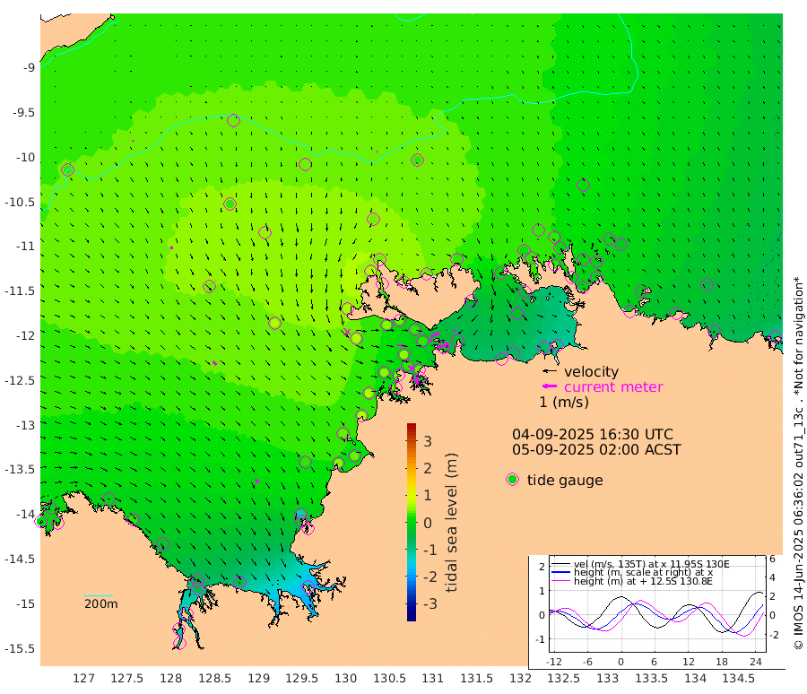 84cm/s 78T +4cm/s rms + 6cm/s 51T. Darwin_C1 52m 32cm/s 90T +4cm/s rms + 7cm/s -161T. Darwin_CW1 22m 22cm/s 73T +4cm/s rms + 8cm/s 61T. Darwin_CW2 34m 15cm/s 87T +3cm/s rms + 9cm/s 98T. Darwin_CW3 22m 5cm/s 78T +5cm/s rms + 7cm/s 88T. Darwin_C3 56m 64cm/s 64T +2cm/s rms + 9cm/s -126T. Darwin_CTbW 22m 4cm/s 179T +9cm/s rms + 2cm/s -110T. NWSLYN 196m 44cm/s 94T +1cm/s rms + 1cm/s -47T. DARBGF 30m 7cm/s 130T +7cm/s rms + 2cm/s -137T. ITFTIS 464m 22cm/s 166T +9cm/s rms + 1cm/s 74T. ITFMHB 146m 30cm/s 147T +4cm/s rms + 1cm/s -134T. ITFJBG 61m 36cm/s 135T +6cm/s rms + 4cm/s 121T. ITFFTB 108m 45cm/s 123T +4cm/s rms + 3cm/s 80T. NRSDAR 19m 10cm Carronade Island 9cm Guy Point 12cm Napier Broome Bay -9cm Lesueur Island -18cm Reveley Island 26cm Rocky Island -50cm Cape Domett -40cm Lacrosse Island -82cm Adolphus Island -124cm Pender Point -139cm Wyndham 41cm The Boxers 33cm Unnamed Shoal 36cm Loxton Shoal -47cm Pelican Island 49cm Calder Shoal 39cm Evans Shoal -131cm Quoin Island -2cm Port Keats -21cm Jones Point -124cm Catfish Island 32cm Cape Scott Offshore 48cm Cape Ford 36cm Anson Bay 40cm Goodrich Bank 36cm Peron Island North 62cm Point Jenny 62cm Native Point 47cm Fish Reef 48cm Tapa Bay 60cm Point Fawcett (Offshore) 42cm Burge Point 54cm Munkunuwa 66cm Beagle A 33cm Parsons Bank 48cm Fenton Patches 28cm Lynedoch Bank 25cm Hancox Shoal Area 44cm Nightcliff 16cm Darwin 25cm Charles Point Patches -12cm Glyde Point -50cm Chambers Bay -66cm Point Stuart -28cm Cape Hotham -28cm Christine Reef -74cm West Alligator Head -97cm East Field Island -35cm Two Hills Bay 66cm Newby Shoal -39cm Camp Point 42cm Medina Inlet South 58cm South Barlow Point 58cm St. Asaph Bay 43cm Cape Van Dieman 38cm Snake Bay 40cm Cache Point 28cm Echo Shoal 31cm Point Jahleel (Off) 13cm Cape Don 20cm Port Essington 31cm Smith Point - West 23cm NW Peacock Island 26cm North Of Jones Shoal 8cm Peacock Island -4cm Point David 25cm D'urville Point 9cm Money Shoal -6cm Copeland Island -3cm Cape Cockburn 0cm One Tree Point -15cm Hogmany Shoal -2cm New Year Island - West -3cm Grant Island -17cm Aurari Bay -26cm Cuthbert Point -15cm North Goulburn Island -45cm Paxie Shoal -53cm Entrance Island -83cm Yabooma Island