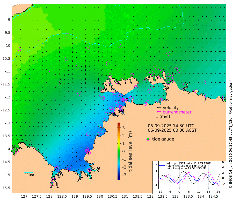 103cm/s -101T +4cm/s rms + 6cm/s 51T. Darwin_C1 52m 93cm/s -92T +4cm/s rms + 7cm/s -161T. Darwin_CW1 22m 57cm/s -106T +4cm/s rms + 8cm/s 61T. Darwin_CW2 34m 67cm/s -139T +3cm/s rms + 9cm/s 98T. Darwin_CW3 22m 96cm/s -90T +5cm/s rms + 7cm/s 88T. Darwin_C3 56m 56cm/s -116T +2cm/s rms + 9cm/s -126T. Darwin_CTbW 22m 4cm/s -130T +9cm/s rms + 2cm/s -110T. NWSLYN 196m 8cm/s -135T +1cm/s rms + 1cm/s -47T. DARBGF 30m 10cm/s 154T +7cm/s rms + 2cm/s -137T. ITFTIS 464m 15cm/s 168T +9cm/s rms + 1cm/s 74T. ITFMHB 146m 7cm/s 93T +4cm/s rms + 1cm/s -134T. ITFJBG 61m 16cm/s 133T +6cm/s rms + 4cm/s 121T. ITFFTB 108m 6cm/s -157T +4cm/s rms + 3cm/s 80T. NRSDAR 19m 15cm Carronade Island 13cm Guy Point 14cm Napier Broome Bay -76cm Lesueur Island -140cm Reveley Island -39cm Rocky Island -214cm Cape Domett -196cm Lacrosse Island -226cm Adolphus Island -195cm Pender Point -188cm Wyndham -27cm The Boxers -44cm Unnamed Shoal 31cm Loxton Shoal -234cm Pelican Island -5cm Calder Shoal 24cm Evans Shoal -273cm Quoin Island -216cm Port Keats -215cm Jones Point -246cm Catfish Island -152cm Cape Scott Offshore -144cm Cape Ford -173cm Anson Bay 4cm Goodrich Bank -138cm Peron Island North -139cm Point Jenny -138cm Native Point -146cm Fish Reef -165cm Tapa Bay -62cm Point Fawcett (Offshore) -173cm Burge Point -135cm Munkunuwa -116cm Beagle A -165cm Parsons Bank -168cm Fenton Patches 9cm Lynedoch Bank -176cm Hancox Shoal Area -182cm Nightcliff -199cm Darwin -183cm Charles Point Patches -159cm Glyde Point -150cm Chambers Bay -140cm Point Stuart -139cm Cape Hotham -129cm Christine Reef -148cm West Alligator Head -150cm East Field Island -117cm Two Hills Bay -73cm Newby Shoal -132cm Camp Point -155cm Medina Inlet South -46cm South Barlow Point -25cm St. Asaph Bay 2cm Cape Van Dieman -4cm Snake Bay -3cm Cache Point 41cm Echo Shoal -18cm Point Jahleel (Off) -63cm Cape Don -28cm Port Essington -23cm Smith Point - West -23cm NW Peacock Island -10cm North Of Jones Shoal -5cm Peacock Island -50cm Point David -27cm D'urville Point -30cm Money Shoal -52cm Copeland Island -62cm Cape Cockburn -46cm One Tree Point -67cm Hogmany Shoal -53cm New Year Island - West -53cm Grant Island -74cm Aurari Bay -89cm Cuthbert Point -71cm North Goulburn Island -109cm Paxie Shoal -117cm Entrance Island -140cm Yabooma Island