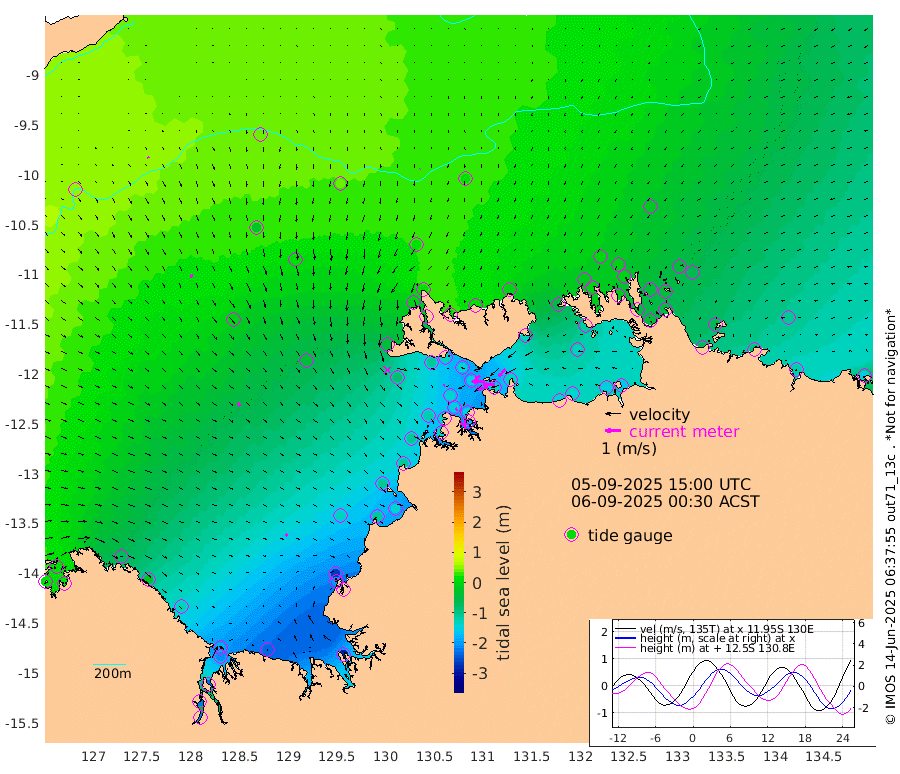 74cm/s -101T +4cm/s rms + 6cm/s 51T. Darwin_C1 52m 78cm/s -93T +4cm/s rms + 7cm/s -161T. Darwin_CW1 22m 45cm/s -105T +4cm/s rms + 8cm/s 61T. Darwin_CW2 34m 61cm/s -140T +3cm/s rms + 9cm/s 98T. Darwin_CW3 22m 84cm/s -90T +5cm/s rms + 7cm/s 88T. Darwin_C3 56m 36cm/s -116T +2cm/s rms + 9cm/s -126T. Darwin_CTbW 22m 5cm/s -147T +9cm/s rms + 2cm/s -110T. NWSLYN 196m 12cm/s 121T +1cm/s rms + 1cm/s -47T. DARBGF 30m 10cm/s 146T +7cm/s rms + 2cm/s -137T. ITFTIS 464m 19cm/s 164T +9cm/s rms + 1cm/s 74T. ITFMHB 146m 14cm/s 121T +4cm/s rms + 1cm/s -134T. ITFJBG 61m 25cm/s 132T +6cm/s rms + 4cm/s 121T. ITFFTB 108m 17cm/s 141T +4cm/s rms + 3cm/s 80T. NRSDAR 19m 17cm Carronade Island 15cm Guy Point 16cm Napier Broome Bay -69cm Lesueur Island -132cm Reveley Island -32cm Rocky Island -210cm Cape Domett -190cm Lacrosse Island -232cm Adolphus Island -216cm Pender Point -215cm Wyndham -9cm The Boxers -23cm Unnamed Shoal 41cm Loxton Shoal -227cm Pelican Island 14cm Calder Shoal 36cm Evans Shoal -291cm Quoin Island -196cm Port Keats -199cm Jones Point -264cm Catfish Island -127cm Cape Scott Offshore -108cm Cape Ford -144cm Anson Bay 19cm Goodrich Bank -111cm Peron Island North -106cm Point Jenny -105cm Native Point -116cm Fish Reef -133cm Tapa Bay -35cm Point Fawcett (Offshore) -142cm Burge Point -105cm Munkunuwa -83cm Beagle A -138cm Parsons Bank -136cm Fenton Patches 19cm Lynedoch Bank -151cm Hancox Shoal Area -152cm Nightcliff -173cm Darwin -155cm Charles Point Patches -146cm Glyde Point -151cm Chambers Bay -146cm Point Stuart -132cm Cape Hotham -127cm Christine Reef -157cm West Alligator Head -166cm East Field Island -115cm Two Hills Bay -44cm Newby Shoal -129cm Camp Point -126cm Medina Inlet South -21cm South Barlow Point -2cm St. Asaph Bay 19cm Cape Van Dieman 13cm Snake Bay 13cm Cache Point 48cm Echo Shoal -4cm Point Jahleel (Off) -51cm Cape Don -15cm Port Essington -8cm Smith Point - West -10cm NW Peacock Island 2cm North Of Jones Shoal -1cm Peacock Island -41cm Point David -13cm D'urville Point -20cm Money Shoal -44cm Copeland Island -51cm Cape Cockburn -37cm One Tree Point -59cm Hogmany Shoal -43cm New Year Island - West -44cm Grant Island -67cm Aurari Bay -83cm Cuthbert Point -64cm North Goulburn Island -107cm Paxie Shoal -117cm Entrance Island -147cm Yabooma Island