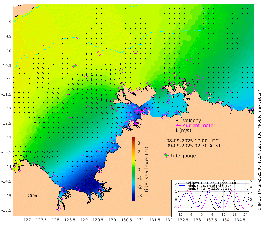 118cm/s -101T +4cm/s rms + 6cm/s 51T. Darwin_C1 52m 100cm/s -92T +4cm/s rms + 7cm/s -161T. Darwin_CW1 22m 69cm/s -106T +4cm/s rms + 8cm/s 61T. Darwin_CW2 34m 87cm/s -137T +3cm/s rms + 9cm/s 98T. Darwin_CW3 22m 134cm/s -90T +5cm/s rms + 7cm/s 88T. Darwin_C3 56m 53cm/s -116T +2cm/s rms + 9cm/s -126T. Darwin_CTbW 22m 6cm/s 177T +9cm/s rms + 2cm/s -110T. NWSLYN 196m 30cm/s 110T +1cm/s rms + 1cm/s -47T. DARBGF 30m 12cm/s 104T +7cm/s rms + 2cm/s -137T. ITFTIS 464m 20cm/s 139T +9cm/s rms + 1cm/s 74T. ITFMHB 146m 30cm/s 119T +4cm/s rms + 1cm/s -134T. ITFJBG 61m 44cm/s 120T +6cm/s rms + 4cm/s 121T. ITFFTB 108m 40cm/s 138T +4cm/s rms + 3cm/s 80T. NRSDAR 19m 54cm Carronade Island 45cm Guy Point 53cm Napier Broome Bay -47cm Lesueur Island -177cm Reveley Island -64cm Rocky Island -294cm Cape Domett -253cm Lacrosse Island -339cm Adolphus Island -324cm Pender Point -321cm Wyndham 36cm The Boxers 33cm Unnamed Shoal 92cm Loxton Shoal -312cm Pelican Island 62cm Calder Shoal 80cm Evans Shoal -430cm Quoin Island -258cm Port Keats -251cm Jones Point -348cm Catfish Island -145cm Cape Scott Offshore -96cm Cape Ford -165cm Anson Bay 66cm Goodrich Bank -124cm Peron Island North -116cm Point Jenny -113cm Native Point -125cm Fish Reef -151cm Tapa Bay -4cm Point Fawcett (Offshore) -172cm Burge Point -127cm Munkunuwa -73cm Beagle A -177cm Parsons Bank -155cm Fenton Patches 63cm Lynedoch Bank -191cm Hancox Shoal Area -188cm Nightcliff -213cm Darwin -176cm Charles Point Patches -182cm Glyde Point -205cm Chambers Bay -203cm Point Stuart -169cm Cape Hotham -182cm Christine Reef -223cm West Alligator Head -234cm East Field Island -154cm Two Hills Bay -17cm Newby Shoal -162cm Camp Point -145cm Medina Inlet South 8cm South Barlow Point 38cm St. Asaph Bay 67cm Cape Van Dieman 59cm Snake Bay 59cm Cache Point 107cm Echo Shoal 28cm Point Jahleel (Off) -47cm Cape Don 11cm Port Essington 17cm Smith Point - West 15cm NW Peacock Island 36cm North Of Jones Shoal 10cm Peacock Island -28cm Point David 10cm D'urville Point 7cm Money Shoal -34cm Copeland Island -39cm Cape Cockburn -23cm One Tree Point -50cm Hogmany Shoal -25cm New Year Island - West -34cm Grant Island -64cm Aurari Bay -100cm Cuthbert Point -65cm North Goulburn Island -130cm Paxie Shoal -155cm Entrance Island -205cm Yabooma Island