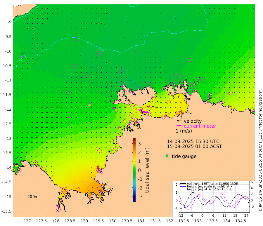 106cm/s 79T +4cm/s rms + 6cm/s 51T. Darwin_C1 52m 85cm/s 91T +4cm/s rms + 7cm/s -161T. Darwin_CW1 22m 37cm/s 71T +4cm/s rms + 8cm/s 61T. Darwin_CW2 34m 61cm/s 47T +3cm/s rms + 9cm/s 98T. Darwin_CW3 22m 68cm/s 91T +5cm/s rms + 7cm/s 88T. Darwin_C3 56m 61cm/s 66T +2cm/s rms + 9cm/s -126T. Darwin_CTbW 22m 3cm/s -2T +9cm/s rms + 2cm/s -110T. NWSLYN 196m 21cm/s -74T +1cm/s rms + 1cm/s -47T. DARBGF 30m 7cm/s -119T +7cm/s rms + 2cm/s -137T. ITFTIS 464m 9cm/s -120T +9cm/s rms + 1cm/s 74T. ITFMHB 146m 17cm/s -49T +4cm/s rms + 1cm/s -134T. ITFJBG 61m 20cm/s -66T +6cm/s rms + 4cm/s 121T. ITFFTB 108m 34cm/s -49T +4cm/s rms + 3cm/s 80T. NRSDAR 19m 75cm Carronade Island 82cm Guy Point 79cm Napier Broome Bay 88cm Lesueur Island 128cm Reveley Island 73cm Rocky Island 186cm Cape Domett 173cm Lacrosse Island 211cm Adolphus Island 234cm Pender Point 254cm Wyndham 6cm The Boxers -13cm Unnamed Shoal -22cm Loxton Shoal 178cm Pelican Island -10cm Calder Shoal -21cm Evans Shoal 262cm Quoin Island 138cm Port Keats 125cm Jones Point 299cm Catfish Island 81cm Cape Scott Offshore 35cm Cape Ford 77cm Anson Bay -30cm Goodrich Bank 65cm Peron Island North 67cm Point Jenny 62cm Native Point 64cm Fish Reef 72cm Tapa Bay 12cm Point Fawcett (Offshore) 83cm Burge Point 51cm Munkunuwa 46cm Beagle A 75cm Parsons Bank 78cm Fenton Patches -28cm Lynedoch Bank 90cm Hancox Shoal Area 93cm Nightcliff 88cm Darwin 69cm Charles Point Patches 105cm Glyde Point 147cm Chambers Bay 156cm Point Stuart 111cm Cape Hotham 144cm Christine Reef 177cm West Alligator Head 192cm East Field Island 118cm Two Hills Bay 38cm Newby Shoal 106cm Camp Point 62cm Medina Inlet South -12cm South Barlow Point -15cm St. Asaph Bay -32cm Cape Van Dieman -35cm Snake Bay -19cm Cache Point -20cm Echo Shoal -4cm Point Jahleel (Off) 36cm Cape Don -8cm Port Essington -5cm Smith Point - West -7cm NW Peacock Island -14cm North Of Jones Shoal -5cm Peacock Island 2cm Point David -7cm D'urville Point -10cm Money Shoal 6cm Copeland Island 14cm Cape Cockburn 4cm One Tree Point 21cm Hogmany Shoal 6cm New Year Island - West 10cm Grant Island 22cm Aurari Bay 47cm Cuthbert Point 25cm North Goulburn Island 59cm Paxie Shoal 69cm Entrance Island 93cm Yabooma Island