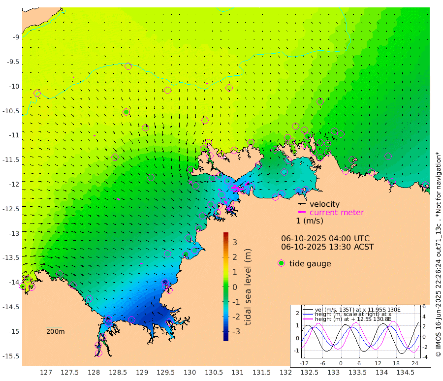 87cm/s -101T +4cm/s rms + 6cm/s 51T. Darwin_C1 52m 85cm/s -92T +4cm/s rms + 7cm/s -161T. Darwin_CW1 22m 47cm/s -106T +4cm/s rms + 8cm/s 61T. Darwin_CW2 34m 70cm/s -138T +3cm/s rms + 9cm/s 98T. Darwin_CW3 22m 95cm/s -90T +5cm/s rms + 7cm/s 88T. Darwin_C3 56m 37cm/s -115T +2cm/s rms + 9cm/s -126T. Darwin_CTbW 22m 15cm/s 160T +9cm/s rms + 2cm/s -110T. NWSLYN 196m 33cm/s 105T +1cm/s rms + 1cm/s -47T. DARBGF 30m 9cm/s 87T +7cm/s rms + 2cm/s -137T. ITFTIS 464m 17cm/s 138T +9cm/s rms + 1cm/s 74T. ITFMHB 146m 28cm/s 121T +4cm/s rms + 1cm/s -134T. ITFJBG 61m 40cm/s 122T +6cm/s rms + 4cm/s 121T. ITFFTB 108m 41cm/s 134T +4cm/s rms + 3cm/s 80T. NRSDAR 19m 36cm Carronade Island 35cm Guy Point 37cm Napier Broome Bay -56cm Lesueur Island -145cm Reveley Island -74cm Rocky Island -244cm Cape Domett -219cm Lacrosse Island -290cm Adolphus Island -276cm Pender Point -284cm Wyndham 38cm The Boxers 28cm Unnamed Shoal 79cm Loxton Shoal -245cm Pelican Island 55cm Calder Shoal 76cm Evans Shoal -371cm Quoin Island -203cm Port Keats -194cm Jones Point -289cm Catfish Island -102cm Cape Scott Offshore -41cm Cape Ford -112cm Anson Bay 67cm Goodrich Bank -86cm Peron Island North -69cm Point Jenny -69cm Native Point -87cm Fish Reef -99cm Tapa Bay 17cm Point Fawcett (Offshore) -124cm Burge Point -85cm Munkunuwa -52cm Beagle A -121cm Parsons Bank -120cm Fenton Patches 60cm Lynedoch Bank -133cm Hancox Shoal Area -141cm Nightcliff -154cm Darwin -117cm Charles Point Patches -142cm Glyde Point -161cm Chambers Bay -171cm Point Stuart -137cm Cape Hotham -145cm Christine Reef -192cm West Alligator Head -210cm East Field Island -124cm Two Hills Bay -14cm Newby Shoal -128cm Camp Point -99cm Medina Inlet South 23cm South Barlow Point 45cm St. Asaph Bay 70cm Cape Van Dieman 60cm Snake Bay 63cm Cache Point 84cm Echo Shoal 35cm Point Jahleel (Off) -19cm Cape Don 34cm Port Essington 36cm Smith Point - West 35cm NW Peacock Island 48cm North Of Jones Shoal 15cm Peacock Island 7cm Point David 33cm D'urville Point 33cm Money Shoal 2cm Copeland Island 2cm Cape Cockburn 9cm One Tree Point 5cm Hogmany Shoal 3cm New Year Island - West 2cm Grant Island -29cm Aurari Bay -42cm Cuthbert Point -19cm North Goulburn Island -63cm Paxie Shoal -84cm Entrance Island -121cm Yabooma Island