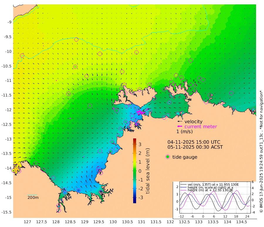 122cm/s -101T +4cm/s rms + 6cm/s 51T. Darwin_C1 52m 110cm/s -91T +4cm/s rms + 7cm/s -161T. Darwin_CW1 22m 71cm/s -106T +4cm/s rms + 8cm/s 61T. Darwin_CW2 34m 69cm/s -135T +3cm/s rms + 9cm/s 98T. Darwin_CW3 22m 123cm/s -91T +5cm/s rms + 7cm/s 88T. Darwin_C3 56m 61cm/s -115T +2cm/s rms + 9cm/s -126T. Darwin_CTbW 22m 7cm/s 159T +9cm/s rms + 2cm/s -110T. NWSLYN 196m 7cm/s 165T +1cm/s rms + 1cm/s -47T. DARBGF 30m 9cm/s 75T +7cm/s rms + 2cm/s -137T. ITFTIS 464m 11cm/s 102T +9cm/s rms + 1cm/s 74T. ITFMHB 146m 13cm/s 80T +4cm/s rms + 1cm/s -134T. ITFJBG 61m 23cm/s 104T +6cm/s rms + 4cm/s 121T. ITFFTB 108m 12cm/s 169T +4cm/s rms + 3cm/s 80T. NRSDAR 19m 100cm Carronade Island 94cm Guy Point 102cm Napier Broome Bay 15cm Lesueur Island -113cm Reveley Island -31cm Rocky Island -198cm Cape Domett -168cm Lacrosse Island -214cm Adolphus Island -180cm Pender Point -161cm Wyndham 55cm The Boxers 47cm Unnamed Shoal 106cm Loxton Shoal -223cm Pelican Island 69cm Calder Shoal 86cm Evans Shoal -275cm Quoin Island -194cm Port Keats -193cm Jones Point -187cm Catfish Island -117cm Cape Scott Offshore -95cm Cape Ford -139cm Anson Bay 71cm Goodrich Bank -103cm Peron Island North -106cm Point Jenny -103cm Native Point -111cm Fish Reef -133cm Tapa Bay -4cm Point Fawcett (Offshore) -149cm Burge Point -126cm Munkunuwa -67cm Beagle A -152cm Parsons Bank -135cm Fenton Patches 75cm Lynedoch Bank -158cm Hancox Shoal Area -163cm Nightcliff -172cm Darwin -140cm Charles Point Patches -131cm Glyde Point -129cm Chambers Bay -124cm Point Stuart -115cm Cape Hotham -116cm Christine Reef -137cm West Alligator Head -134cm East Field Island -93cm Two Hills Bay 2cm Newby Shoal -98cm Camp Point -126cm Medina Inlet South 9cm South Barlow Point 35cm St. Asaph Bay 69cm Cape Van Dieman 66cm Snake Bay 66cm Cache Point 122cm Echo Shoal 40cm Point Jahleel (Off) -18cm Cape Don 30cm Port Essington 31cm Smith Point - West 33cm NW Peacock Island 50cm North Of Jones Shoal 15cm Peacock Island 1cm Point David 28cm D'urville Point 32cm Money Shoal -5cm Copeland Island -2cm Cape Cockburn 7cm One Tree Point -4cm Hogmany Shoal 8cm New Year Island - West 0cm Grant Island -26cm Aurari Bay -50cm Cuthbert Point -24cm North Goulburn Island -73cm Paxie Shoal -92cm Entrance Island -130cm Yabooma Island