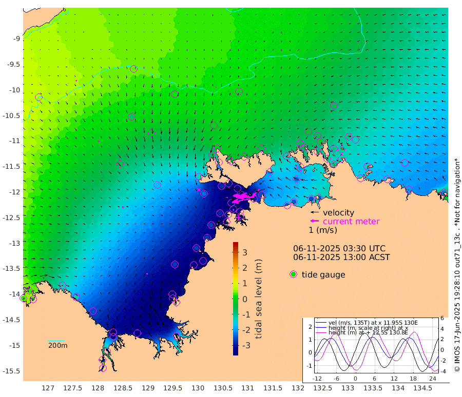 234cm/s -101T +4cm/s rms + 6cm/s 51T. Darwin_C1 52m 198cm/s -91T +4cm/s rms + 7cm/s -161T. Darwin_CW1 22m 122cm/s -106T +4cm/s rms + 8cm/s 61T. Darwin_CW2 34m 120cm/s -136T +3cm/s rms + 9cm/s 98T. Darwin_CW3 22m 202cm/s -90T +5cm/s rms + 7cm/s 88T. Darwin_C3 56m 130cm/s -115T +2cm/s rms + 9cm/s -126T. Darwin_CTbW 22m 10cm/s -170T +9cm/s rms + 2cm/s -110T. NWSLYN 196m 22cm/s -116T +1cm/s rms + 1cm/s -47T. DARBGF 30m 12cm/s 129T +7cm/s rms + 2cm/s -137T. ITFTIS 464m 15cm/s 143T +9cm/s rms + 1cm/s 74T. ITFMHB 146m 15cm/s 66T +4cm/s rms + 1cm/s -134T. ITFJBG 61m 24cm/s 117T +6cm/s rms + 4cm/s 121T. ITFFTB 108m 12cm/s -128T +4cm/s rms + 3cm/s 80T. NRSDAR 19m 30cm Carronade Island 30cm Guy Point 31cm Napier Broome Bay -128cm Lesueur Island -255cm Reveley Island -117cm Rocky Island -371cm Cape Domett -339cm Lacrosse Island -387cm Adolphus Island -301cm Pender Point -285cm Wyndham -55cm The Boxers -83cm Unnamed Shoal 40cm Loxton Shoal -395cm Pelican Island -27cm Calder Shoal 22cm Evans Shoal -446cm Quoin Island -386cm Port Keats -371cm Jones Point -338cm Catfish Island -269cm Cape Scott Offshore -310cm Cape Ford -300cm Anson Bay -10cm Goodrich Bank -269cm Peron Island North -265cm Point Jenny -264cm Native Point -283cm Fish Reef -304cm Tapa Bay -128cm Point Fawcett (Offshore) -335cm Burge Point -271cm Munkunuwa -234cm Beagle A -324cm Parsons Bank -323cm Fenton Patches 3cm Lynedoch Bank -326cm Hancox Shoal Area -338cm Nightcliff -365cm Darwin -329cm Charles Point Patches -284cm Glyde Point -238cm Chambers Bay -238cm Point Stuart -250cm Cape Hotham -228cm Christine Reef -253cm West Alligator Head -244cm East Field Island -211cm Two Hills Bay -169cm Newby Shoal -216cm Camp Point -295cm Medina Inlet South -109cm South Barlow Point -65cm St. Asaph Bay -14cm Cape Van Dieman -26cm Snake Bay -24cm Cache Point 72cm Echo Shoal -52cm Point Jahleel (Off) -125cm Cape Don -64cm Port Essington -64cm Smith Point - West -62cm NW Peacock Island -32cm North Of Jones Shoal -14cm Peacock Island -96cm Point David -70cm D'urville Point -57cm Money Shoal -99cm Copeland Island -131cm Cape Cockburn -91cm One Tree Point -129cm Hogmany Shoal -99cm New Year Island - West -107cm Grant Island -130cm Aurari Bay -159cm Cuthbert Point -129cm North Goulburn Island -169cm Paxie Shoal -194cm Entrance Island -219cm Yabooma Island