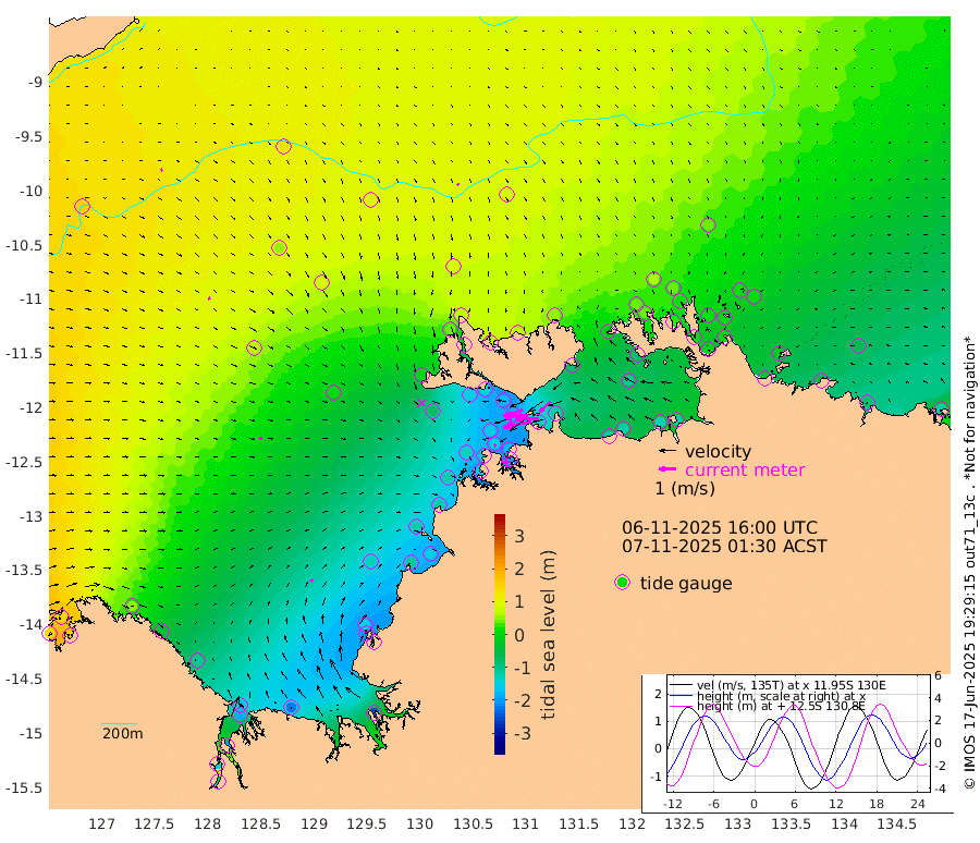168cm/s -101T +4cm/s rms + 6cm/s 51T. Darwin_C1 52m 142cm/s -90T +4cm/s rms + 7cm/s -161T. Darwin_CW1 22m 92cm/s -107T +4cm/s rms + 8cm/s 61T. Darwin_CW2 34m 83cm/s -134T +3cm/s rms + 9cm/s 98T. Darwin_CW3 22m 149cm/s -91T +5cm/s rms + 7cm/s 88T. Darwin_C3 56m 89cm/s -115T +2cm/s rms + 9cm/s -126T. Darwin_CTbW 22m 10cm/s 148T +9cm/s rms + 2cm/s -110T. NWSLYN 196m 12cm/s -121T +1cm/s rms + 1cm/s -47T. DARBGF 30m 11cm/s 56T +7cm/s rms + 2cm/s -137T. ITFTIS 464m 14cm/s 70T +9cm/s rms + 1cm/s 74T. ITFMHB 146m 16cm/s 43T +4cm/s rms + 1cm/s -134T. ITFJBG 61m 22cm/s 84T +6cm/s rms + 4cm/s 121T. ITFFTB 108m 12cm/s -126T +4cm/s rms + 3cm/s 80T. NRSDAR 19m 146cm Carronade Island 143cm Guy Point 151cm Napier Broome Bay 45cm Lesueur Island -111cm Reveley Island -42cm Rocky Island -190cm Cape Domett -160cm Lacrosse Island -197cm Adolphus Island -142cm Pender Point -111cm Wyndham 71cm The Boxers 51cm Unnamed Shoal 127cm Loxton Shoal -223cm Pelican Island 81cm Calder Shoal 98cm Evans Shoal -254cm Quoin Island -201cm Port Keats -205cm Jones Point -149cm Catfish Island -125cm Cape Scott Offshore -112cm Cape Ford -149cm Anson Bay 80cm Goodrich Bank -119cm Peron Island North -118cm Point Jenny -115cm Native Point -128cm Fish Reef -147cm Tapa Bay -7cm Point Fawcett (Offshore) -166cm Burge Point -153cm Munkunuwa -77cm Beagle A -176cm Parsons Bank -150cm Fenton Patches 87cm Lynedoch Bank -173cm Hancox Shoal Area -178cm Nightcliff -188cm Darwin -149cm Charles Point Patches -134cm Glyde Point -114cm Chambers Bay -115cm Point Stuart -116cm Cape Hotham -104cm Christine Reef -128cm West Alligator Head -115cm East Field Island -89cm Two Hills Bay 7cm Newby Shoal -85cm Camp Point -143cm Medina Inlet South 3cm South Barlow Point 37cm St. Asaph Bay 76cm Cape Van Dieman 71cm Snake Bay 74cm Cache Point 149cm Echo Shoal 45cm Point Jahleel (Off) -14cm Cape Don 35cm Port Essington 34cm Smith Point - West 38cm NW Peacock Island 60cm North Of Jones Shoal 18cm Peacock Island 4cm Point David 30cm D'urville Point 44cm Money Shoal -2cm Copeland Island 1cm Cape Cockburn 11cm One Tree Point 2cm Hogmany Shoal 15cm New Year Island - West 4cm Grant Island -24cm Aurari Bay -45cm Cuthbert Point -20cm North Goulburn Island -61cm Paxie Shoal -85cm Entrance Island -118cm Yabooma Island
