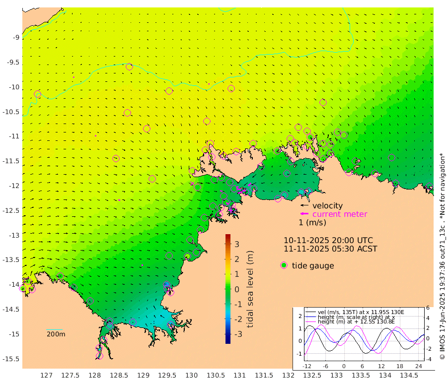 65cm/s -101T +4cm/s rms + 6cm/s 51T. Darwin_C1 52m 41cm/s -92T +4cm/s rms + 7cm/s -161T. Darwin_CW1 22m 17cm/s -110T +4cm/s rms + 8cm/s 61T. Darwin_CW2 34m 53cm/s -137T +3cm/s rms + 9cm/s 98T. Darwin_CW3 22m 36cm/s -90T +5cm/s rms + 7cm/s 88T. Darwin_C3 56m 30cm/s -116T +2cm/s rms + 9cm/s -126T. Darwin_CTbW 22m 13cm/s 136T +9cm/s rms + 2cm/s -110T. NWSLYN 196m 28cm/s 99T +1cm/s rms + 1cm/s -47T. DARBGF 30m 14cm/s 39T +7cm/s rms + 2cm/s -137T. ITFTIS 464m 14cm/s 59T +9cm/s rms + 1cm/s 74T. ITFMHB 146m 17cm/s 105T +4cm/s rms + 1cm/s -134T. ITFJBG 61m 25cm/s 97T +6cm/s rms + 4cm/s 121T. ITFFTB 108m 30cm/s 134T +4cm/s rms + 3cm/s 80T. NRSDAR 19m 43cm Carronade Island 44cm Guy Point 52cm Napier Broome Bay 19cm Lesueur Island -58cm Reveley Island -45cm Rocky Island -104cm Cape Domett -89cm Lacrosse Island -137cm Adolphus Island -141cm Pender Point -148cm Wyndham 81cm The Boxers 83cm Unnamed Shoal 103cm Loxton Shoal -112cm Pelican Island 90cm Calder Shoal 89cm Evans Shoal -180cm Quoin Island -65cm Port Keats -73cm Jones Point -198cm Catfish Island -7cm Cape Scott Offshore 48cm Cape Ford -5cm Anson Bay 91cm Goodrich Bank 2cm Peron Island North 7cm Point Jenny 11cm Native Point -1cm Fish Reef -3cm Tapa Bay 65cm Point Fawcett (Offshore) -14cm Burge Point -2cm Munkunuwa 22cm Beagle A -23cm Parsons Bank -16cm Fenton Patches 88cm Lynedoch Bank -31cm Hancox Shoal Area -27cm Nightcliff -24cm Darwin 6cm Charles Point Patches -48cm Glyde Point -94cm Chambers Bay -108cm Point Stuart -60cm Cape Hotham -83cm Christine Reef -128cm West Alligator Head -142cm East Field Island -66cm Two Hills Bay 60cm Newby Shoal -48cm Camp Point 3cm Medina Inlet South 74cm South Barlow Point 82cm St. Asaph Bay 92cm Cape Van Dieman 94cm Snake Bay 84cm Cache Point 96cm Echo Shoal 63cm Point Jahleel (Off) 24cm Cape Don 63cm Port Essington 58cm Smith Point - West 59cm NW Peacock Island 76cm North Of Jones Shoal 25cm Peacock Island 40cm Point David 56cm D'urville Point 67cm Money Shoal 33cm Copeland Island 43cm Cape Cockburn 45cm One Tree Point 37cm Hogmany Shoal 44cm New Year Island - West 38cm Grant Island 11cm Aurari Bay -8cm Cuthbert Point 18cm North Goulburn Island -9cm Paxie Shoal -42cm Entrance Island -71cm Yabooma Island