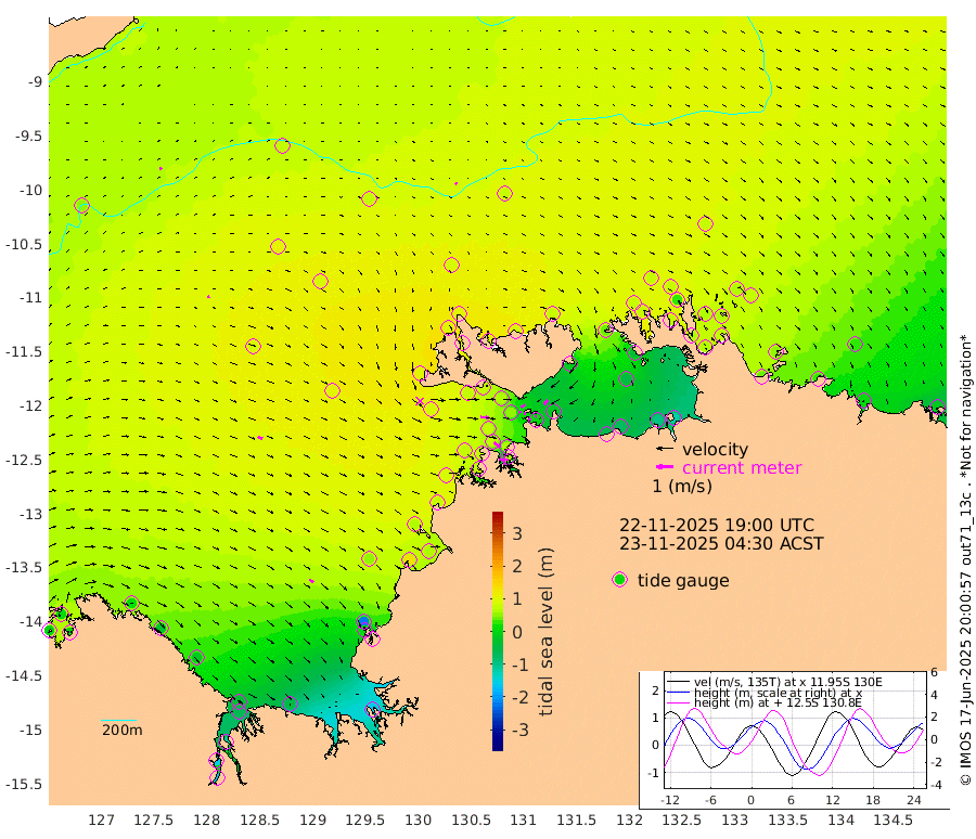 9cm/s 79T +4cm/s rms + 6cm/s 51T. Darwin_C1 52m 13cm/s -83T +4cm/s rms + 7cm/s -161T. Darwin_CW1 22m 11cm/s 75T +4cm/s rms + 8cm/s 61T. Darwin_CW2 34m 33cm/s -143T +3cm/s rms + 9cm/s 98T. Darwin_CW3 22m 12cm/s -87T +5cm/s rms + 7cm/s 88T. Darwin_C3 56m 25cm/s 60T +2cm/s rms + 9cm/s -126T. Darwin_CTbW 22m 9cm/s 132T +9cm/s rms + 2cm/s -110T. NWSLYN 196m 46cm/s 95T +1cm/s rms + 1cm/s -47T. DARBGF 30m 13cm/s 33T +7cm/s rms + 2cm/s -137T. ITFTIS 464m 11cm/s 66T +9cm/s rms + 1cm/s 74T. ITFMHB 146m 28cm/s 134T +4cm/s rms + 1cm/s -134T. ITFJBG 61m 30cm/s 111T +6cm/s rms + 4cm/s 121T. ITFFTB 108m 47cm/s 128T +4cm/s rms + 3cm/s 80T. NRSDAR 19m 2cm Carronade Island -3cm Guy Point 6cm Napier Broome Bay 18cm Lesueur Island -18cm Reveley Island -33cm Rocky Island -58cm Cape Domett -45cm Lacrosse Island -109cm Adolphus Island -149cm Pender Point -171cm Wyndham 79cm The Boxers 112cm Unnamed Shoal 69cm Loxton Shoal -54cm Pelican Island 86cm Calder Shoal 68cm Evans Shoal -166cm Quoin Island 7cm Port Keats 3cm Jones Point -225cm Catfish Island 48cm Cape Scott Offshore 134cm Cape Ford 61cm Anson Bay 86cm Goodrich Bank 63cm Peron Island North 78cm Point Jenny 83cm Native Point 69cm Fish Reef 76cm Tapa Bay 93cm Point Fawcett (Offshore) 71cm Burge Point 76cm Munkunuwa 87cm Beagle A 63cm Parsons Bank 69cm Fenton Patches 74cm Lynedoch Bank 49cm Hancox Shoal Area 59cm Nightcliff 57cm Darwin 73cm Charles Point Patches 8cm Glyde Point -64cm Chambers Bay -77cm Point Stuart -13cm Cape Hotham -50cm Christine Reef -96cm West Alligator Head -123cm East Field Island -34cm Two Hills Bay 96cm Newby Shoal -19cm Camp Point 73cm Medina Inlet South 101cm South Barlow Point 94cm St. Asaph Bay 92cm Cape Van Dieman 97cm Snake Bay 83cm Cache Point 50cm Echo Shoal 70cm Point Jahleel (Off) 44cm Cape Don 70cm Port Essington 70cm Smith Point - West 71cm NW Peacock Island 71cm North Of Jones Shoal 25cm Peacock Island 67cm Point David 73cm D'urville Point 70cm Money Shoal 60cm Copeland Island 74cm Cape Cockburn 62cm One Tree Point 69cm Hogmany Shoal 66cm New Year Island - West 64cm Grant Island 44cm Aurari Bay 29cm Cuthbert Point 49cm North Goulburn Island 24cm Paxie Shoal 8cm Entrance Island -22cm Yabooma Island