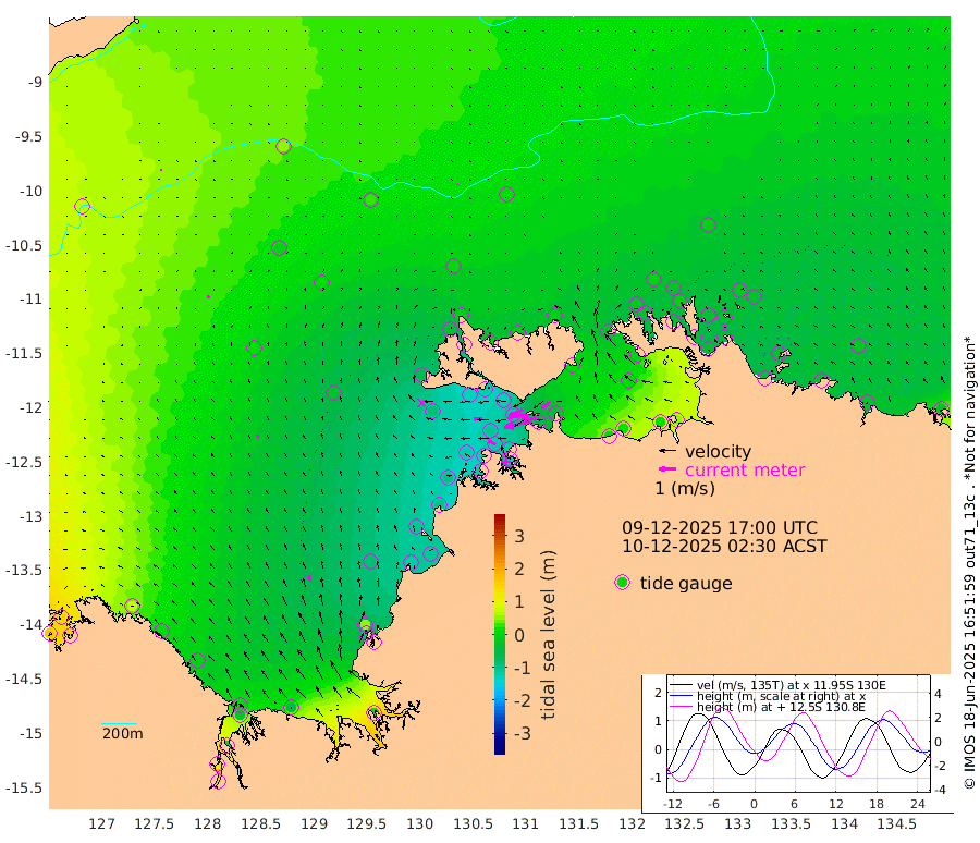 164cm/s -102T +4cm/s rms + 6cm/s 51T. Darwin_C1 52m 104cm/s -89T +4cm/s rms + 7cm/s -161T. Darwin_CW1 22m 78cm/s -108T +4cm/s rms + 8cm/s 61T. Darwin_CW2 34m 61cm/s -128T +3cm/s rms + 9cm/s 98T. Darwin_CW3 22m 88cm/s -91T +5cm/s rms + 7cm/s 88T. Darwin_C3 56m 91cm/s -115T +2cm/s rms + 9cm/s -126T. Darwin_CTbW 22m 4cm/s 126T +9cm/s rms + 2cm/s -110T. NWSLYN 196m 53cm/s -90T +1cm/s rms + 1cm/s -47T. DARBGF 30m 8cm/s 16T +7cm/s rms + 2cm/s -137T. ITFTIS 464m 16cm/s 14T +9cm/s rms + 1cm/s 74T. ITFMHB 146m 36cm/s -18T +4cm/s rms + 1cm/s -134T. ITFJBG 61m 25cm/s -23T +6cm/s rms + 4cm/s 121T. ITFFTB 108m 47cm/s -65T +4cm/s rms + 3cm/s 80T. NRSDAR 19m 153cm Carronade Island 160cm Guy Point 168cm Napier Broome Bay 76cm Lesueur Island -6cm Reveley Island 6cm Rocky Island -15cm Cape Domett -9cm Lacrosse Island 5cm Adolphus Island 114cm Pender Point 153cm Wyndham 21cm The Boxers -5cm Unnamed Shoal 55cm Loxton Shoal -60cm Pelican Island 17cm Calder Shoal 23cm Evans Shoal 13cm Quoin Island -88cm Port Keats -92cm Jones Point 48cm Catfish Island -87cm Cape Scott Offshore -115cm Cape Ford -110cm Anson Bay 3cm Goodrich Bank -107cm Peron Island North -100cm Point Jenny -99cm Native Point -116cm Fish Reef -114cm Tapa Bay -59cm Point Fawcett (Offshore) -114cm Burge Point -128cm Munkunuwa -88cm Beagle A -130cm Parsons Bank -112cm Fenton Patches 18cm Lynedoch Bank -114cm Hancox Shoal Area -119cm Nightcliff -125cm Darwin -115cm Charles Point Patches -58cm Glyde Point 6cm Chambers Bay 14cm Point Stuart -36cm Cape Hotham 9cm Christine Reef 20cm West Alligator Head 54cm East Field Island -10cm Two Hills Bay -24cm Newby Shoal 4cm Camp Point -117cm Medina Inlet South -58cm South Barlow Point -33cm St. Asaph Bay -4cm Cape Van Dieman -9cm Snake Bay -2cm Cache Point 75cm Echo Shoal -11cm Point Jahleel (Off) -26cm Cape Don -22cm Port Essington -29cm Smith Point - West -23cm NW Peacock Island -10cm North Of Jones Shoal -6cm Peacock Island -31cm Point David -32cm D'urville Point -9cm Money Shoal -34cm Copeland Island -44cm Cape Cockburn -28cm One Tree Point -29cm Hogmany Shoal -22cm New Year Island - West -28cm Grant Island -42cm Aurari Bay -39cm Cuthbert Point -36cm North Goulburn Island -21cm Paxie Shoal -32cm Entrance Island -31cm Yabooma Island