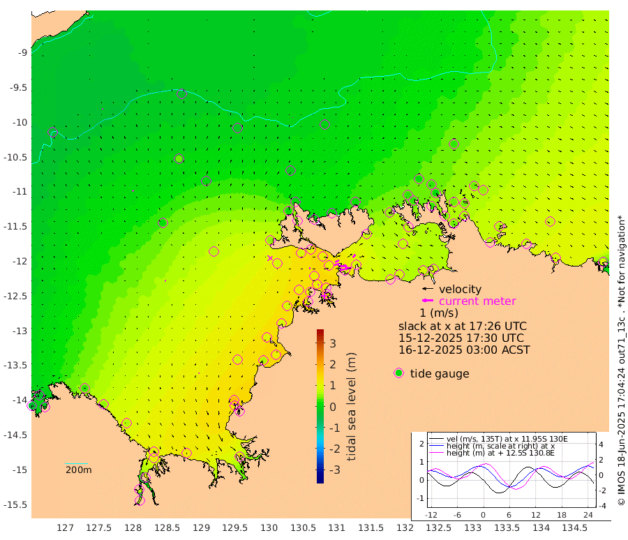 67cm/s 77T +4cm/s rms + 6cm/s 51T. Darwin_C1 52m 52cm/s 88T +4cm/s rms + 7cm/s -161T. Darwin_CW1 22m 46cm/s 74T +4cm/s rms + 8cm/s 61T. Darwin_CW2 34m 35cm/s 46T +3cm/s rms + 9cm/s 98T. Darwin_CW3 22m 75cm/s 89T +5cm/s rms + 7cm/s 88T. Darwin_C3 56m 38cm/s 65T +2cm/s rms + 9cm/s -126T. Darwin_CTbW 22m 3cm/s -8T +9cm/s rms + 2cm/s -110T. NWSLYN 196m 12cm/s 76T +1cm/s rms + 1cm/s -47T. DARBGF 30m 5cm/s -32T +7cm/s rms + 2cm/s -137T. ITFTIS 464m 9cm/s -15T +9cm/s rms + 1cm/s 74T. ITFMHB 146m 5cm/s -154T +4cm/s rms + 1cm/s -134T. ITFJBG 61m 5cm/s -55T +6cm/s rms + 4cm/s 121T. ITFFTB 108m 8cm/s 88T +4cm/s rms + 3cm/s 80T. NRSDAR 19m -26cm Carronade Island -37cm Guy Point -18cm Napier Broome Bay 28cm Lesueur Island 64cm Reveley Island 56cm Rocky Island 108cm Cape Domett 97cm Lacrosse Island 107cm Adolphus Island 75cm Pender Point 74cm Wyndham 21cm The Boxers 42cm Unnamed Shoal -24cm Loxton Shoal 117cm Pelican Island 2cm Calder Shoal -16cm Evans Shoal 135cm Quoin Island 119cm Port Keats 121cm Jones Point 170cm Catfish Island 89cm Cape Scott Offshore 66cm Cape Ford 105cm Anson Bay -1cm Goodrich Bank 92cm Peron Island North 88cm Point Jenny 87cm Native Point 103cm Fish Reef 98cm Tapa Bay 46cm Point Fawcett (Offshore) 111cm Burge Point 88cm Munkunuwa 80cm Beagle A 109cm Parsons Bank 108cm Fenton Patches -2cm Lynedoch Bank 103cm Hancox Shoal Area 110cm Nightcliff 125cm Darwin 111cm Charles Point Patches 99cm Glyde Point 82cm Chambers Bay 86cm Point Stuart 86cm Cape Hotham 72cm Christine Reef 90cm West Alligator Head 86cm East Field Island 77cm Two Hills Bay 60cm Newby Shoal 73cm Camp Point 103cm Medina Inlet South 38cm South Barlow Point 18cm St. Asaph Bay 2cm Cape Van Dieman 9cm Snake Bay 7cm Cache Point -36cm Echo Shoal 16cm Point Jahleel (Off) 50cm Cape Don 28cm Port Essington 26cm Smith Point - West 25cm NW Peacock Island 15cm North Of Jones Shoal 7cm Peacock Island 40cm Point David 30cm D'urville Point 26cm Money Shoal 41cm Copeland Island 58cm Cape Cockburn 41cm One Tree Point 45cm Hogmany Shoal 44cm New Year Island - West 44cm Grant Island 60cm Aurari Bay 71cm Cuthbert Point 57cm North Goulburn Island 72cm Paxie Shoal 81cm Entrance Island 92cm Yabooma Island