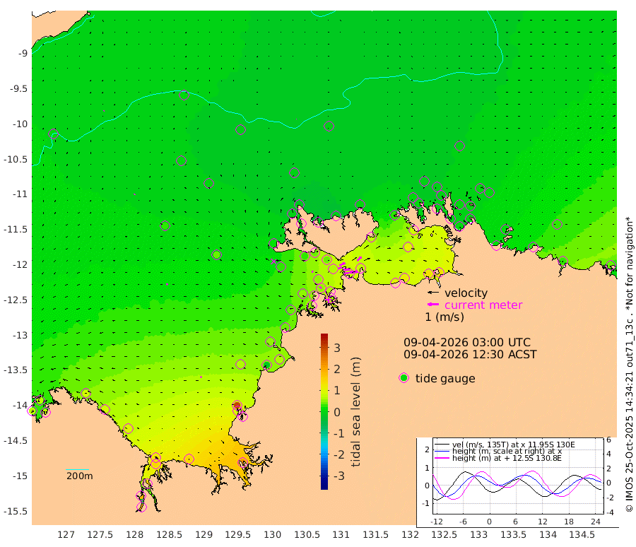 89cm/s 79T +4cm/s rms + 6cm/s 51T. Darwin_C1 52m 73cm/s 91T +4cm/s rms + 7cm/s -161T. Darwin_CW1 22m 34cm/s 70T +4cm/s rms + 8cm/s 61T. Darwin_CW2 34m 51cm/s 49T +3cm/s rms + 9cm/s 98T. Darwin_CW3 22m 59cm/s 91T +5cm/s rms + 7cm/s 88T. Darwin_C3 56m 54cm/s 66T +2cm/s rms + 9cm/s -126T. Darwin_CTbW 22m 2cm/s -17T +9cm/s rms + 2cm/s -110T. NWSLYN 196m 14cm/s -71T +1cm/s rms + 1cm/s -47T. DARBGF 30m 4cm/s -124T +7cm/s rms + 2cm/s -137T. ITFTIS 464m 6cm/s -127T +9cm/s rms + 1cm/s 74T. ITFMHB 146m 13cm/s -43T +4cm/s rms + 1cm/s -134T. ITFJBG 61m 13cm/s -64T +6cm/s rms + 4cm/s 121T. ITFFTB 108m 26cm/s -49T +4cm/s rms + 3cm/s 80T. NRSDAR 19m 69cm Carronade Island 73cm Guy Point 76cm Napier Broome Bay 83cm Lesueur Island 96cm Reveley Island 81cm Rocky Island 140cm Cape Domett 133cm Lacrosse Island 167cm Adolphus Island 183cm Pender Point 203cm Wyndham 23cm The Boxers 4cm Unnamed Shoal 3cm Loxton Shoal 136cm Pelican Island 6cm Calder Shoal -2cm Evans Shoal 216cm Quoin Island 101cm Port Keats 89cm Jones Point 293cm Catfish Island 66cm Cape Scott Offshore -14cm Cape Ford 62cm Anson Bay -10cm Goodrich Bank 48cm Peron Island North 44cm Point Jenny 41cm Native Point 46cm Fish Reef 49cm Tapa Bay 16cm Point Fawcett (Offshore) 46cm Burge Point 28cm Munkunuwa 33cm Beagle A 43cm Parsons Bank 51cm Fenton Patches -7cm Lynedoch Bank 58cm Hancox Shoal Area 62cm Nightcliff 60cm Darwin 51cm Charles Point Patches 75cm Glyde Point 110cm Chambers Bay 114cm Point Stuart 78cm Cape Hotham 102cm Christine Reef 130cm West Alligator Head 144cm East Field Island 88cm Two Hills Bay 34cm Newby Shoal 78cm Camp Point 44cm Medina Inlet South -2cm South Barlow Point -2cm St. Asaph Bay -14cm Cape Van Dieman -14cm Snake Bay -4cm Cache Point 9cm Echo Shoal 5cm Point Jahleel (Off) 30cm Cape Don 0cm Port Essington 3cm Smith Point - West 0cm NW Peacock Island -1cm North Of Jones Shoal -1cm Peacock Island -1cm Point David -1cm D'urville Point -4cm Money Shoal 0cm Copeland Island 4cm Cape Cockburn 4cm One Tree Point 10cm Hogmany Shoal 6cm New Year Island - West 5cm Grant Island 16cm Aurari Bay 28cm Cuthbert Point 13cm North Goulburn Island 32cm Paxie Shoal 33cm Entrance Island 42cm Yabooma Island