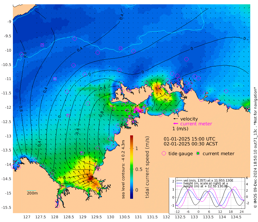 153cm/s -102T +4cm/s rms + 6cm/s 51T. Darwin_C1 52m 100cm/s -89T +4cm/s rms + 7cm/s -161T. Darwin_CW1 22m 76cm/s -110T +4cm/s rms + 8cm/s 61T. Darwin_CW2 34m 56cm/s -124T +3cm/s rms + 9cm/s 98T. Darwin_CW3 22m 76cm/s -92T +5cm/s rms + 7cm/s 88T. Darwin_C3 56m 86cm/s -115T +2cm/s rms + 9cm/s -126T. Darwin_CTbW 22m 4cm/s 130T +9cm/s rms + 2cm/s -110T. NWSLYN 196m 52cm/s -89T +1cm/s rms + 1cm/s -47T. DARBGF 30m 7cm/s 9T +7cm/s rms + 2cm/s -137T. ITFTIS 464m 15cm/s 11T +9cm/s rms + 1cm/s 74T. ITFMHB 146m 39cm/s -20T +4cm/s rms + 1cm/s -134T. ITFJBG 61m 28cm/s -28T +6cm/s rms + 4cm/s 121T. ITFFTB 108m 46cm/s -63T +4cm/s rms + 3cm/s 80T. NRSDAR 19m 162cm Carronade Island 167cm Guy Point 176cm Napier Broome Bay 93cm Lesueur Island 8cm Reveley Island 34cm Rocky Island 10cm Cape Domett 10cm Lacrosse Island 46cm Adolphus Island 146cm Pender Point 190cm Wyndham 37cm The Boxers 0cm Unnamed Shoal 73cm Loxton Shoal -30cm Pelican Island 29cm Calder Shoal 43cm Evans Shoal 67cm Quoin Island -73cm Port Keats -74cm Jones Point 153cm Catfish Island -74cm Cape Scott Offshore -107cm Cape Ford -101cm Anson Bay 18cm Goodrich Bank -87cm Peron Island North -98cm Point Jenny -98cm Native Point -100cm Fish Reef -111cm Tapa Bay -44cm Point Fawcett (Offshore) -113cm Burge Point -127cm Munkunuwa -84cm Beagle A -121cm Parsons Bank -110cm Fenton Patches 34cm Lynedoch Bank -107cm Hancox Shoal Area -122cm Nightcliff -110cm Darwin -96cm Charles Point Patches -41cm Glyde Point 29cm Chambers Bay 41cm Point Stuart -17cm Cape Hotham 22cm Christine Reef 49cm West Alligator Head 84cm East Field Island 16cm Two Hills Bay -16cm Newby Shoal 18cm Camp Point -106cm Medina Inlet South -46cm South Barlow Point -21cm St. Asaph Bay 9cm Cape Van Dieman 6cm Snake Bay 16cm Cache Point 95cm Echo Shoal 7cm Point Jahleel (Off) -4cm Cape Don 2cm Port Essington -5cm Smith Point - West 0cm NW Peacock Island 13cm North Of Jones Shoal 2cm Peacock Island -13cm Point David -9cm D'urville Point 11cm Money Shoal -16cm Copeland Island -15cm Cape Cockburn -5cm One Tree Point -1cm Hogmany Shoal -2cm New Year Island - West -7cm Grant Island -20cm Aurari Bay -12cm Cuthbert Point -13cm North Goulburn Island -6cm Paxie Shoal -13cm Entrance Island -13cm Yabooma Island