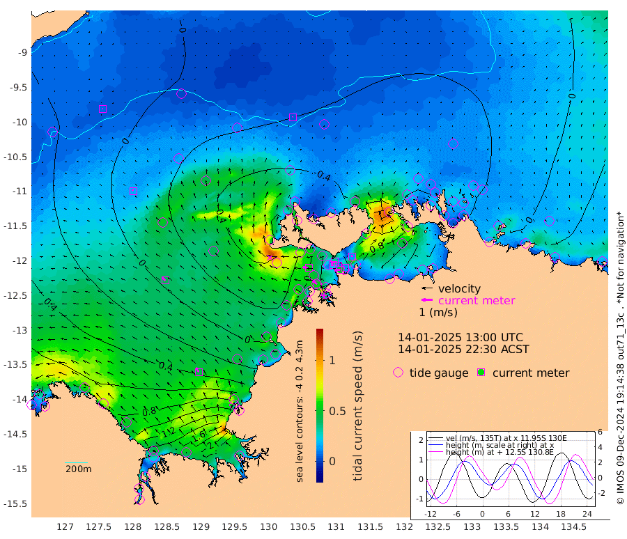 49cm/s -103T +4cm/s rms + 6cm/s 51T. Darwin_C1 52m 12cm/s -79T +4cm/s rms + 7cm/s -161T. Darwin_CW1 22m 21cm/s -116T +4cm/s rms + 8cm/s 61T. Darwin_CW2 34m 13cm/s -11T +3cm/s rms + 9cm/s 98T. Darwin_CW3 22m 10cm/s 107T +5cm/s rms + 7cm/s 88T. Darwin_C3 56m 34cm/s -118T +2cm/s rms + 9cm/s -126T. Darwin_CTbW 22m 5cm/s 15T +9cm/s rms + 2cm/s -110T. NWSLYN 196m 54cm/s -84T +1cm/s rms + 1cm/s -47T. DARBGF 30m 6cm/s -42T +7cm/s rms + 2cm/s -137T. ITFTIS 464m 16cm/s -16T +9cm/s rms + 1cm/s 74T. ITFMHB 146m 45cm/s -32T +4cm/s rms + 1cm/s -134T. ITFJBG 61m 42cm/s -45T +6cm/s rms + 4cm/s 121T. ITFFTB 108m 54cm/s -54T +4cm/s rms + 3cm/s 80T. NRSDAR 19m 131cm Carronade Island 142cm Guy Point 141cm Napier Broome Bay 121cm Lesueur Island 121cm Reveley Island 74cm Rocky Island 178cm Cape Domett 160cm Lacrosse Island 224cm Adolphus Island 305cm Pender Point 336cm Wyndham 17cm The Boxers -13cm Unnamed Shoal 22cm Loxton Shoal 140cm Pelican Island 5cm Calder Shoal -2cm Evans Shoal 274cm Quoin Island 87cm Port Keats 75cm Jones Point 246cm Catfish Island 18cm Cape Scott Offshore -9cm Cape Ford 2cm Anson Bay -18cm Goodrich Bank -3cm Peron Island North -11cm Point Jenny -11cm Native Point -13cm Fish Reef -4cm Tapa Bay -31cm Point Fawcett (Offshore) 12cm Burge Point -23cm Munkunuwa -17cm Beagle A -1cm Parsons Bank 5cm Fenton Patches -5cm Lynedoch Bank 17cm Hancox Shoal Area 11cm Nightcliff 21cm Darwin 8cm Charles Point Patches 62cm Glyde Point 128cm Chambers Bay 137cm Point Stuart 76cm Cape Hotham 119cm Christine Reef 157cm West Alligator Head 191cm East Field Island 91cm Two Hills Bay 13cm Newby Shoal 98cm Camp Point -6cm Medina Inlet South -38cm South Barlow Point -32cm St. Asaph Bay -26cm Cape Van Dieman -25cm Snake Bay -17cm Cache Point 32cm Echo Shoal -8cm Point Jahleel (Off) 14cm Cape Don -17cm Port Essington -23cm Smith Point - West -19cm NW Peacock Island -17cm North Of Jones Shoal -8cm Peacock Island -13cm Point David -25cm D'urville Point -10cm Money Shoal -13cm Copeland Island -13cm Cape Cockburn -10cm One Tree Point 3cm Hogmany Shoal -5cm New Year Island - West -4cm Grant Island -7cm Aurari Bay 13cm Cuthbert Point 2cm North Goulburn Island 35cm Paxie Shoal 43cm Entrance Island 59cm Yabooma Island