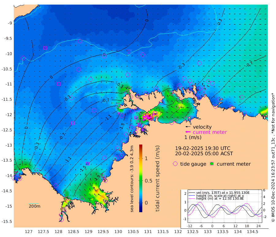 157cm/s -101T +4cm/s rms + 6cm/s 51T. Darwin_C1 52m 108cm/s -91T +4cm/s rms + 7cm/s -161T. Darwin_CW1 22m 82cm/s -106T +4cm/s rms + 8cm/s 61T. Darwin_CW2 34m 76cm/s -135T +3cm/s rms + 9cm/s 98T. Darwin_CW3 22m 133cm/s -91T +5cm/s rms + 7cm/s 88T. Darwin_C3 56m 96cm/s -115T +2cm/s rms + 9cm/s -126T. Darwin_CTbW 22m 6cm/s -164T +9cm/s rms + 2cm/s -110T. NWSLYN 196m 17cm/s -109T +1cm/s rms + 1cm/s -47T. DARBGF 30m 5cm/s 89T +7cm/s rms + 2cm/s -137T. ITFTIS 464m 6cm/s 77T +9cm/s rms + 1cm/s 74T. ITFMHB 146m 10cm/s 71T +4cm/s rms + 1cm/s -134T. ITFJBG 61m 13cm/s 99T +6cm/s rms + 4cm/s 121T. ITFFTB 108m 10cm/s -114T +4cm/s rms + 3cm/s 80T. NRSDAR 19m 6cm Carronade Island 2cm Guy Point 5cm Napier Broome Bay -83cm Lesueur Island -149cm Reveley Island -66cm Rocky Island -215cm Cape Domett -200cm Lacrosse Island -232cm Adolphus Island -182cm Pender Point -178cm Wyndham -35cm The Boxers -48cm Unnamed Shoal 7cm Loxton Shoal -230cm Pelican Island -26cm Calder Shoal -1cm Evans Shoal -282cm Quoin Island -211cm Port Keats -195cm Jones Point -240cm Catfish Island -162cm Cape Scott Offshore -103cm Cape Ford -176cm Anson Bay -10cm Goodrich Bank -155cm Peron Island North -140cm Point Jenny -138cm Native Point -148cm Fish Reef -164cm Tapa Bay -77cm Point Fawcett (Offshore) -168cm Burge Point -146cm Munkunuwa -117cm Beagle A -174cm Parsons Bank -162cm Fenton Patches -7cm Lynedoch Bank -180cm Hancox Shoal Area -191cm Nightcliff -197cm Darwin -175cm Charles Point Patches -153cm Glyde Point -141cm Chambers Bay -133cm Point Stuart -139cm Cape Hotham -128cm Christine Reef -144cm West Alligator Head -136cm East Field Island -124cm Two Hills Bay -86cm Newby Shoal -116cm Camp Point -160cm Medina Inlet South -64cm South Barlow Point -42cm St. Asaph Bay -12cm Cape Van Dieman -23cm Snake Bay -19cm Cache Point 22cm Echo Shoal -36cm Point Jahleel (Off) -74cm Cape Don -39cm Port Essington -43cm Smith Point - West -41cm NW Peacock Island -32cm North Of Jones Shoal -12cm Peacock Island -58cm Point David -45cm D'urville Point -34cm Money Shoal -60cm Copeland Island -79cm Cape Cockburn -58cm One Tree Point -73cm Hogmany Shoal -61cm New Year Island - West -64cm Grant Island -78cm Aurari Bay -87cm Cuthbert Point -77cm North Goulburn Island -96cm Paxie Shoal -106cm Entrance Island -120cm Yabooma Island